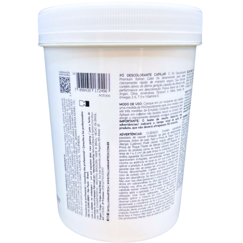 Desenvolvido para obter clareamento rápido e seguro. Contém ativos capazes de oferecer excelentes resultados. A combinação do Pó Descolorante Premium Itallian Color e da Emulsão Oxidante Estabilizada Itallian Color garante uma mistura homogênea e consistente que não escorre no processo de coloração. Clareia até 9 tons. A proporção da mistura pode variar de 1:1, 5 a 1:3, de acordo com a técnica utilizada.