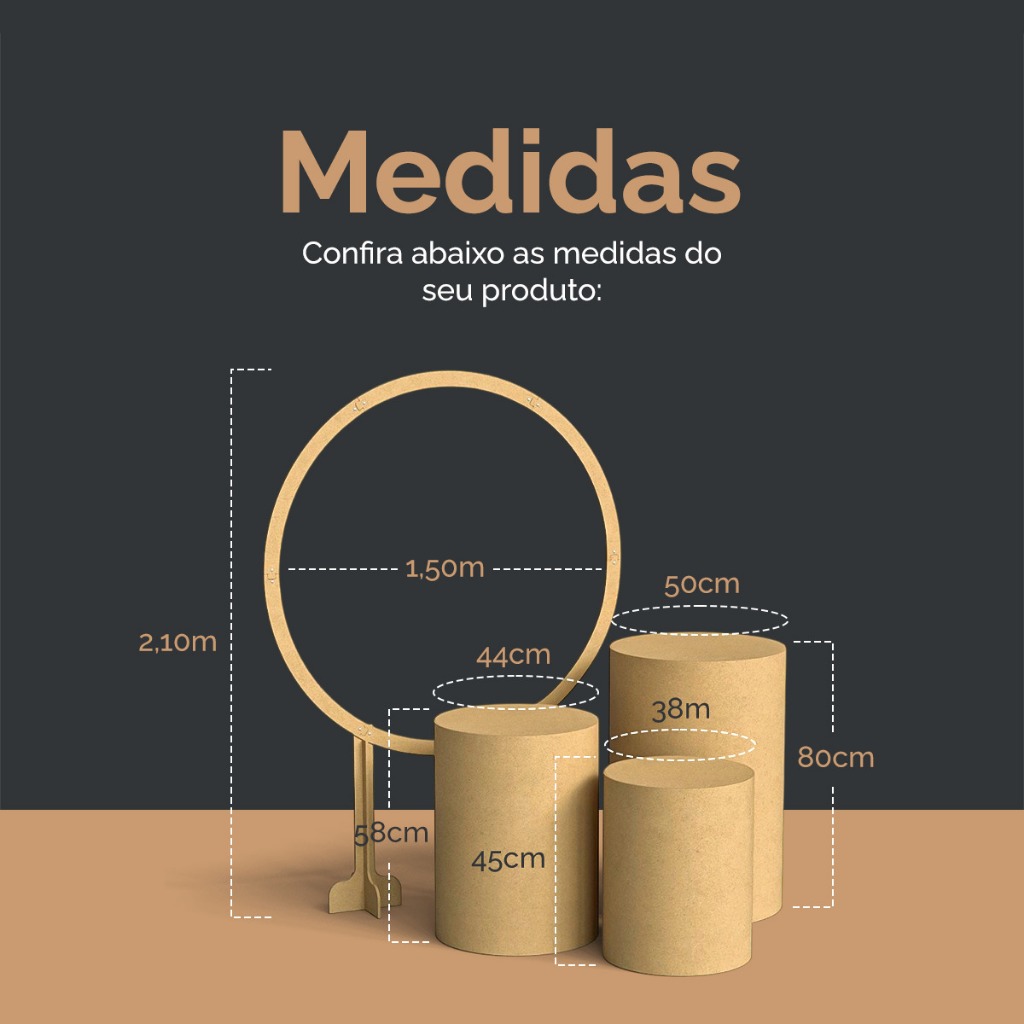 Atenção: Comprar apenas 1 kit devido o tamanho da embalagem, caso seja feita a compra de 2 kits ou mais não será possível enviar. Agradecemos pela compreensão! Os painéis e cilindros podem ser elementos decorativos muito vistosos e chamativos. Eles adicionam cor, estilo e personalidade à festa, criando um ambiente festivo e alegre. Produto resistente. Material: MDF de primeira linha Arauco. O produto é enviado desmontado, acompanha : Cola, parafusos, arruelas, porca borboleta e vídeo explicando a montagem! Especificações Técnicas: Painel Espessura Circulo Painel : 06.00mm Travas Painel : 06.00mm Espessura Pés Painel : 06.00mm Diâmetro Painel : 150 cm Altura Painel : 210 cm Trio de Mesas Espessura Lateral: 2.50 mm Espessura Fundo: 6.00 mm Espessura Tampa: 6.00 mm Cilindro grande: Altura: 80.00 cm Diâmetro: 50.00 cm Circunferência: 1580.00 mm Cilindro médio: Altura: 58.00 cm Diâmetro: 44.00 cm Circunferência: 1390.00 mm Cilindro pequeno: Altura: 45.00 cm Diâmetro: 38.00 cm Circunferência: 1200.50 mm Olha a Festa