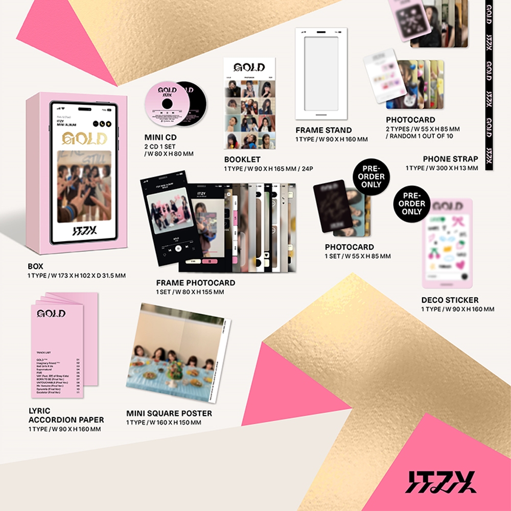 ◈ITZY [ GOLD ]◈ ✨ITZY [ GOLD ] Phone Box ver ✨ Contents - Outbox - Mini CD - Booklet - Frame Stand - Photo card - Frame Photo card - Lyric Accordion Paper - Mini Square Poster ✅FIRST PRESS ONLY - Photo card 1set - Deco Sticker 📅 Released on October 15, 2024 #itzy