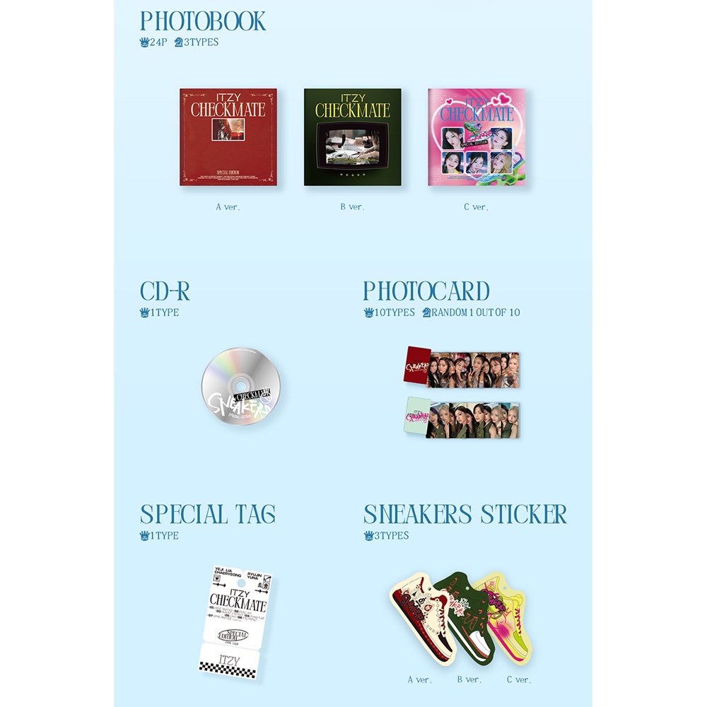 Descrição do produto em inglês após português ◈ITZY - Mini Álbum Checkmate Edição Especial◈ 💿ITZY - Mini Álbum Checkmate Edição Especial 🎵 Índice - Caixa Embalagem - Livro Foto 24p - CD-R - Cartão de foto 1ea (1 de 10) - Etiqueta especial - Adesivo Sneakers - Cartão Pós + Adesivo Lacre 1ea (1 de 10) - Poster Lyric 📅 Lançado em 8 de Agosto de 2022 . Riscos muito finos ou impressões não são motivos para reembolso ou devolução. ✔Outbox é um agente protetor para proteger este produto, e não há troca ou reembolso por contaminação ou danos que podem ocorrer durante o processo de distribuição. ✔Pode haver alguns riscos no produto devido ao processo de fabricação. Este é um fenômeno natural que ocorre durante a produção e não é um produto defeituoso, portanto trocas/retornos não são possíveis. ✔No caso de estampas e matéria impressa (fotocard), impressões, riscos, marcas de imprensa, etc de menos não estão sujeitos a troca ou devolução, exceto por retratos. Também, Não pode trocar ou devolver o cartão fotográfico dobrado que pode ser desdobrado normalmente novamente. ✔Produtos que foram entregues por mais de uma semana não podem ser trocados ou reembolsados e devolvidos. --- 😊Bem-vindo a Nossa Loja, Kpop merca! ⭐KPOP_merch é Coréia baseado Empresa Global Vendas. ⭐Produto selado oficialmente distribuído Brand New & Factory. ⭐Rascos e descoloração menor do estojo não pode ser trocado ou devolvido ⭐Sem Carga para embalagem segura ⭐Pagamento próprio #itzy #itzycheckmate #xadrexe #itzyminialbum #itzycheckmateminialbum #controlo-matespecialedition #oficial ************************************************** Description: ◈ITZY - Mini Album Checkmate Special Edition◈ 💿ITZY - Mini Album Checkmate Special Edition 🎵 Contents - Package Box - Photo Book 24p - CD-R - Photo card 1ea (1 out of 10) - Special Tag - Sneakers Sticker - Post card + Seal Sticker 1ea (1 out of 10) - Lyric Poster 📅 Released on August 8, 2022 ※ Very fine scratches or imprints are not a reason for refund or return. ✔Outbox is a protective agent to protect this product, and there is no exchange or refund because of contamination or damage that may occur during the distribution process. ✔There may be some scratches on the product due to the manufacturing process. This is a natural phenomenon that occurs during production and is not a defective product, so exchanges/returns are not possible. ✔In the case of prints and printed matter (photocard), imprints, scratches, press marks, etc. of less are not subject to exchange or return, except for portraits. Also, You cannot exchange or refund the bent photo card that can be unfolded normally again. ✔Products that have been delivered for more than a week cannot be exchanged or refunded and returned. --- 😊Welcome to Our Store, Kpop merch ! ⭐KPOP_merch is Korea based Global Sales Company. ⭐Officially distributed Brand New & Factory Sealed product. ⭐Minor scratches and discoloration of the case can not be exchanged or returned ⭐No Charge for safe packing ⭐No Down payment #itzy #itzycheckmate #checkmate #itzyminialbum #itzycheckmateminialbum #checkmatespecialedition #official