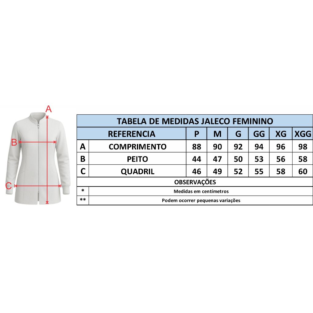 Jaleco Feminino Premium com Zíper Frontal – Elegância, Conforto e Estilo no Seu Ambiente de Trabalho Descubra o poder de um jaleco que vai além da função: o Jaleco Feminino Premium foi desenvolvido para mulheres que desejam unir sofisticação, conforto e performance no dia a dia profissional. Com um corte acinturado e elegante, ele valoriza a silhueta feminina sem abrir mão da liberdade de movimentos. Seu tecido tecnológico 100% poliester oferece um toque suave e estruturado, garantindo conforto durante toda a jornada de trabalho. Destaques que encantam: • Fechamento frontal em zíper da mesma cor do tecido, que traz modernidade e praticidade; • Punhos nas mangas, que proporcionam um ajuste perfeito e evitam contato direto com áreas de trabalho; • Modelagem alongada, com comprimento ideal que cobre o quadril e proporciona elegância e segurança; • Recortes anatômicos que desenham suavemente o corpo, transmitindo postura e profissionalismo; • Design das costas com faixa e botões decorativos, toque de charme e sofisticação; • Abertura traseira inferior, garantindo fluidez e mobilidade ao caminhar; • Bolsos embutidos discretos e funcionais, para manter à mão o essencial do dia a dia. Ideal para profissionais da saúde, estética, odontologia, biomedicina e áreas que exigem apresentação impecável com conforto absoluto **TABELA DE MEDIDAS** P - COMPRIMENTO 88CM / PEITO 44CM / QUADRIL 46CM M - COMPRIMENTO 90CM / PEITO 47CM / QUADRIL 49CM G - COMPRIMENTO 92CM / PEITO 50CM / QUADRIL 52CM GG - COMPRIMENTO 94CM / PEITO 53CM / QUADRIL 55CM XG - COMPRIMENTO 96CM / PEITO 56CM / QUADRIL 58CM XGG - COMPRIMENTO 98CM / PEITO 58CM / QUADRIL 60CM ** As medidas poderão sofrer pequenas variações