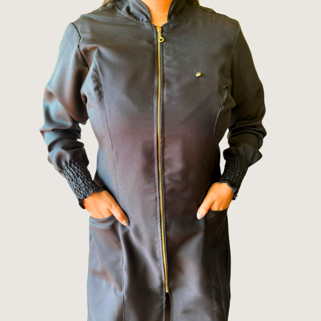 NÃO TRABALHAMOS COM PRONTA ENTREGA! O Jaleco com Punho Elastex é delicado e funcional, apresenta uma modelagem confortável e acinturada. É um jaleco com gola padre. Possui dois bolsos laterais e fechamento em zíper dourado ou metal. Dica Importante: O ideal é ter uma diferença de pelo menos 3cm. O jaleco não pode ficar muito justo, pois pode atrapalhar na movimentação. Verifique suas medidas e compare com a nossa tabela disponível nas fotos. Obs: Por se tratar de um produto de produção artesanal, pode acontecer variações de até 1,5 cm tanto para mais ou para menos nas medidas que foram descritas acima. Algumas cores podem sofrer uma leve alteração de tons. Pois vários fatores podem influenciar como por exemplo: iluminação no ato da fotografia e configuração de cores do monitor ou aparelho celular. ⚠️ QUER BORDAR SEU JALECO? Adicione o produto de bordado no mesmo carrinho! Para garantir o bordado, você DEVE adicionar o item "BORDADOS" (disponível na nossa loja) junto com o jaleco no seu carrinho, antes de finalizar a compra. IMPORTANTE: Após a compra, nos informe imediatamente no Chat ou no campo "MENSAGEM AO VENDEDOR" o NOME E PROFISSÃO para o bordado.