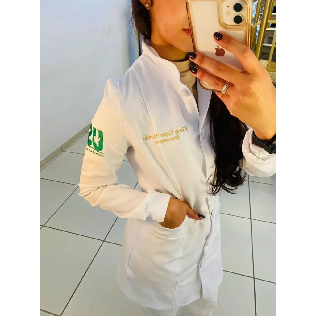 Jaleco feminino tradicional com bordado de nome + brasão de curso IMPORTANTE: Nossos modelos ganharam uma repaginada e algumas coisas mudaram por aqui! POLÍTICA DE ENVIOS: Peças em estoque: portanto, estamos trabalhando com unidades limitadas, envio em 1 (um) dia útil para itens sem bordado e 5 (cinco) dias úteis para peças com bordado. Tamanhos: adequamos os tamanhos à tabela de medidas que fica disponível nas imagens Cores: seguimos a disponibilidade de cores do anúncio (branco, preto, rosê, rosa bebê e areia) - para demais cores consulte via chat POLÍTICA DE TR0CAS: Não realizamos tr0cas e/ou d3voluções de peças personalizadas. Verifique com atenção a cor, tamanho e detalhes para peças com bordado! O jaleco é confeccionado em tecido Two Way. Mas o que isso significa? Ele possui um caimento estruturado, um toque macio e, o mais importante, elastano na composição. E depois de muita pesquisa observamos que para jalecos, esse tecido se comporta muito melhor quando comparado ao: oxford, oxfordine, gabardine e alfaiataria. O corte visa valorizar a silhueta o suficiente para te deixar mais elegante sem perder o profissionalismo. Esse modelo conta com mangas tradicionais, punhos de ribana e opções de botões: plástico ou encapado; Verifique atentamente a opção de bordado selecionada Tabela de medidas nas imagens - os tamanhos podem sofrer variações de no máximo 2cm. Verifque suas medidas antes de efetuar a compra (não efetuamos tr0cas de peças personalizadas) Instruções sobre bordado: Caso deseje o jaleco sem bordado: selecione a opção "SEM BORDADO" Caso deseje o jaleco com bordado do nome (+sobrenome e curso/profissão em baixo do nome): selecione a opção "+ NOME" e envie via chat o nome a ser bordado (e escolha a cor - caso não especifique a cor, será bordado em dourado) Caso deseje o jaleco com bordado do nome (+sobrenome e curso/profissão em baixo do nome) e o brasão do seu curso nos modelos TRADICIONAIS: selecione a opção "+ NOME E BRASÃO DO CURSO", envie via chat o nome a ser bordado (e escolha a cor - caso não especifique a cor, será bordado em dourado) e pelo chat envie qual é o curso e te enviaremos as opções disponíveis Caso deseje o jaleco com bordado do nome (+sobrenome e curso/profissão em baixo do nome) e o brasão do seu curso nos modelos tradicionais + BORDADO DA UNIVERSIDADE: selecione a opção "+ NOME, B. CURSO + FACULDADE ", envie via chat o nome a ser bordado (e escolha a cor - caso não especifique a cor, será bordado em dourado), pelo chat envie qual é o curso e te enviaremos as opções disponíveis e a IMAGEM da logo da universidade que deseja bordar Caso deseje o jaleco com bordado do nome (+sobrenome e curso/profissão em baixo do nome) e o brasão do seu curso EM UM MODELO QUE GOSTOU NA INTERNET: selecione a opção "+ BRASÃO DE CURSO DIFERENTE", envie via chat o nome a ser bordado (e escolha a cor - caso não especifique a cor, será bordado em dourado) e pelo chat envie a imagem do brasão escolhido Caso opte pelo jaleco com bordado do nome (+sobrenome e curso/profissão em baixo do nome) e a SUA LOGO: selecione a opção "+ LOGO", envie via chat o nome a ser bordado (e escolha a cor - caso não especifique a cor, será bordado em dourado) e pelo chat envie a imagem da logo escolhida Escolha brasão e cores de bordado através do chat***