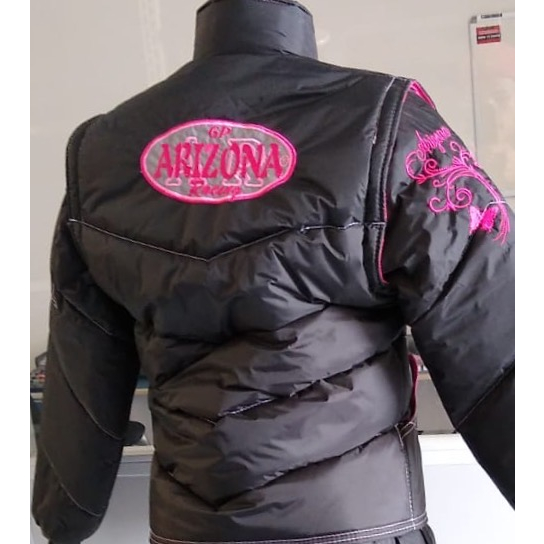 A JAQUETA ARIZONA trás o toque feminino em detalhes Pink Neon ou Verde Neon para você ficar linda e protegida. Pensando no máximo de segurança para você, as jaquetas ARIZONA foram desenvolvidas com REFLETIVOS NEON que se destacam de longe. O produto também conta com uma estrutura acolchoada de alta proteção. Pensando em praticidade, a JAQUETA ARIZONA possui BOLSOS para todas as necessidades. E seu sistema de ZÍPERES nunca enroscam. Para quem quer economizar, o produto é multiuso. Você pode destacar as MANGAS e transformar a jaqueta num colete superseguro. E o melhor de tudo, ela é feita em tecido semipermeável. A jaqueta REFLETIVA ARIZONA contém: - 2 Refletivos Neon (peito e costas) - Bordado Neon com arabescos e borboleta na manga - Mangas destacáveis (use como colete) - Proteção acolchoada de 2,5ml - Bolsos externos super-resistentes - Bolso interno para celular - Bolso na manga com zíper para documentos - Zíper que não enrosca - Capa protetora de zíper com 5 botões - Tecido impermeável - Punho em elástico de 4 costuras - Forro e detalhes em Neon - Acompanha bag em TNT Produto: Jaqueta Arizona Racing GP Feminina a cinturada Cor: Preta com detalhes em Pink Destaque: Refletivos no peito e costas + bordado arabesco no braço + mangas destacáveis (vira colete) + zíper fácil + bolso interno para celular + bolso porta documentos na manga. Material: Nylon resinado 240 resinado com Teflon. Enchimento em manta acrílica, Isolante térmico. Qualquer dúvida sobre o produto, estamos á disposição