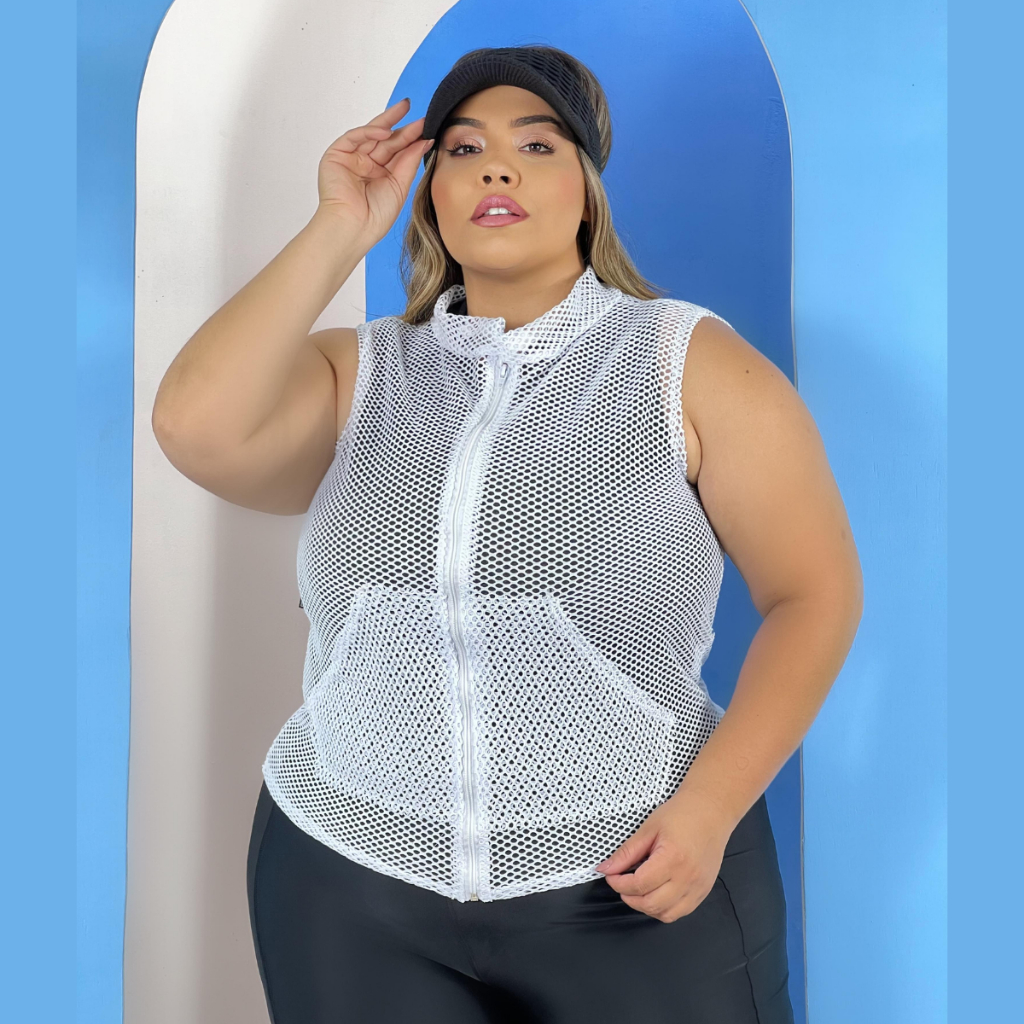jaqueta Colete Academia Fitness Plus Size Tela Arrastão com Bolso Fechamento Ziper