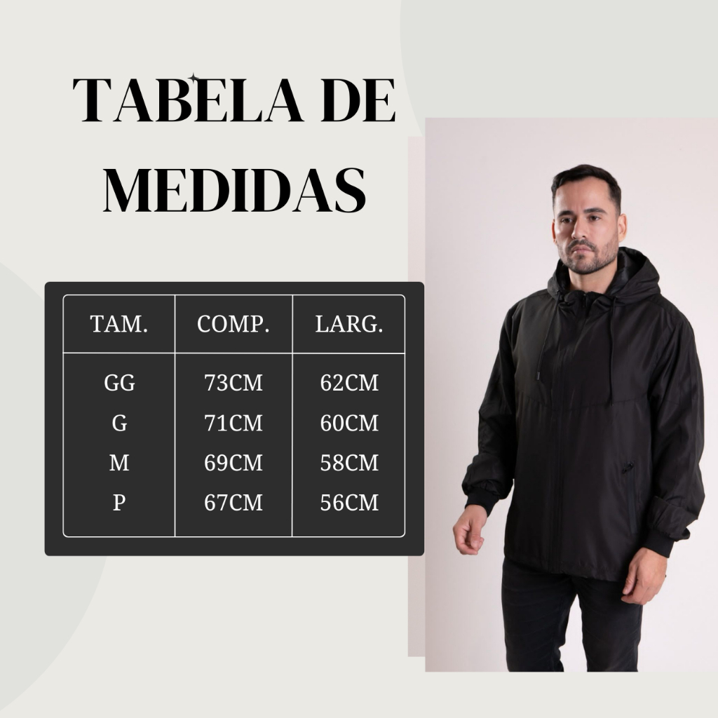 JAQUETA CORTA-VENTO IMPORTADA • Material: Leve, resistente ao vento e à água, ideal para diferentes climas. • Design: Modelagem slim com acabamento premium e detalhes modernos. • Capuz: Ajustável para proteção extra. • Bolsos: Zíper funcional para maior praticidade e segurança. • Cores: Disponível em tonalidades vibrantes e sofisticadas. • Uso: Perfeita para ocasiões casuais, esportivas ou aventuras ao ar livre. COMPOSIÇÃO: TECIDO: 100% POLIÉSTER COM REVESTIMENTO PVC FORRO: 100% POLIÉSTER Tabela Medidas: P M G GG G1 Comprimento: 69cm - 71cm - 74cm - 76cm - 78cm Largura pescoço: 26cm - 27cm - 28cm - 29cm - 31cm Cintura: 55cm - 56cm - 58cm - 61cm - 64cm Ombro: 45cm - 46cm - 47cm - 51cm - 51cm Manga: 65cm - 66cm - 67cm - 68cm - 69cm ** atenção medidas podem ter até 2cm de diferença nas medidas ** Modelo usa tamanho GG peso 94kg altura 1,92