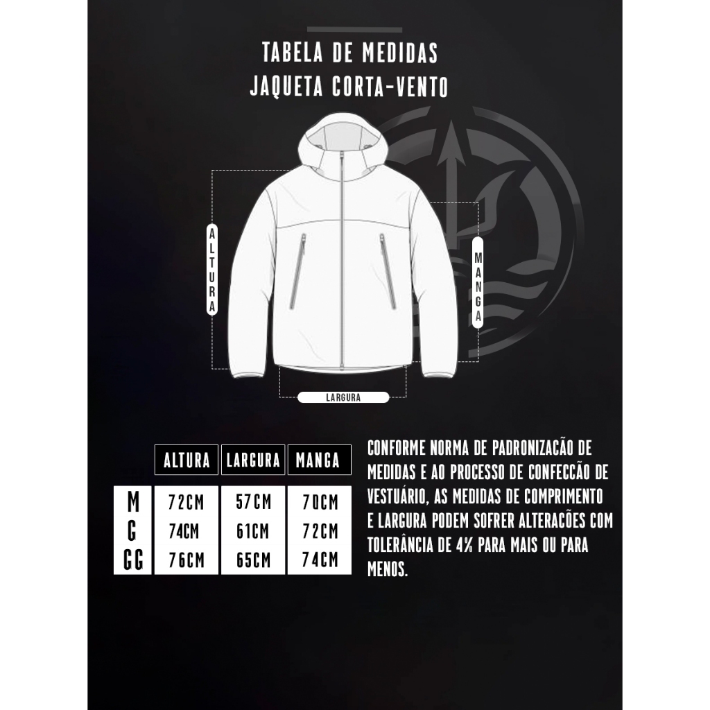🔱 Bem-Vindos a TryBrás Peças produzidas direto da nossa fabrica com ótima Qualidade e Exclusividade. Os pedidos feitos até o Meio-Dia com confirmação de pagamento são enviados no mesmo dia! Sobre o Produto: - Tecido em Tactel; - Cordão de ajuste do capuz. - 2 Bolsos Laterais; - Estampa em DTF de Alta Qualidade; - Elástico na Barra da Cintura e nos punhos; - Ótimo tecido para praticas esportivas; - Secagem Rápida; - Garantimos a DURABILIDADE do tecido; !!! OBSERVAÇÕES: - NÃO É IMPERMEAVEL! - NÃO POSSUI FORRO! 📐 Medidas Jaqueta Corta-Vento: M Comprimento 72cm | Largura 57cm | Manga 70cm G Comprimento 74cm | Largura 61cm | Manga 72cm GG Comprimento 76cm | Largura 65cm | Manga 74cm 🤔Dúvidas Frequentes: - O produto é novo? Sim, todos os nossos produtos são novos. Uma vez feito o pedido, nosso sistema identifica e começa a fabricação, levando-se apenas 1 dia útil para a postagem. - Como saberei se vai servir? As medidas estão descritas acima. Faça um comparativo com uma roupa que lhe vista bem e assim saberá qual o tamanho correto para comprar. Fácil, né? - Como faço para comprar 2, 3 ou + peças da loja pagando apenas um frete? Basta selecionar a quantidade de peças que deseja, coloque no carrinho e finalize a compra junto com as demais peças escolhidas. - Comprei, mas não chegou. O que pode ter acontecido? Raríssimas vezes um pedido é extraviado pelas transportadoras. O entregador pode não ter encontrado seu endereço. Nesse caso, aguarde ou entre em contato conosco. E não se esqueça de conferir se o endereço foi colocado corretamente. Segunda-Feira a Sábado das 8:30 ás 18:00;