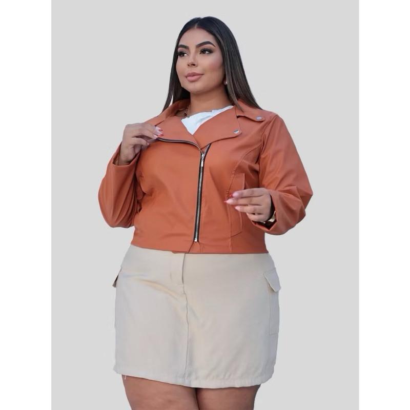 Jaqueta couro fake com ziper e bolso falso do P ao plus Size