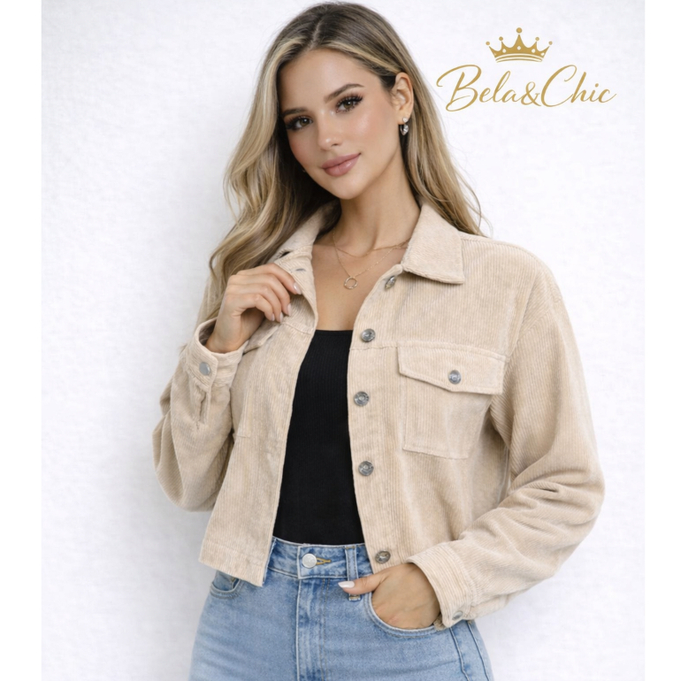 Jaqueta Cropped Feminina Veludo Cotelê Casual Chic com Botões Moda Outono Inverno