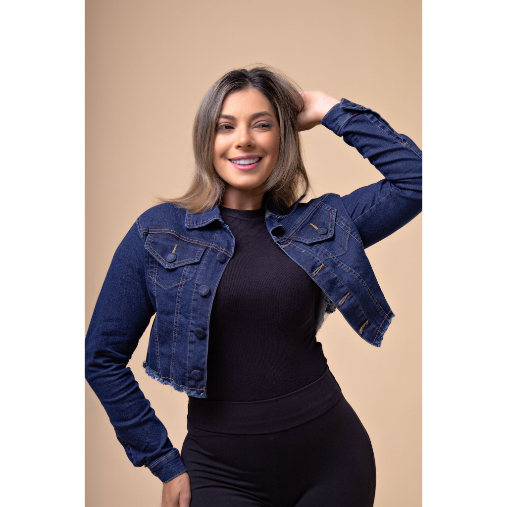 | Jaqueta Jeans Feminina Curta Acinturada Azul Escuro Manga Com Lycra | R$ 74,00 | 22% | 4.6/5 | 10 |