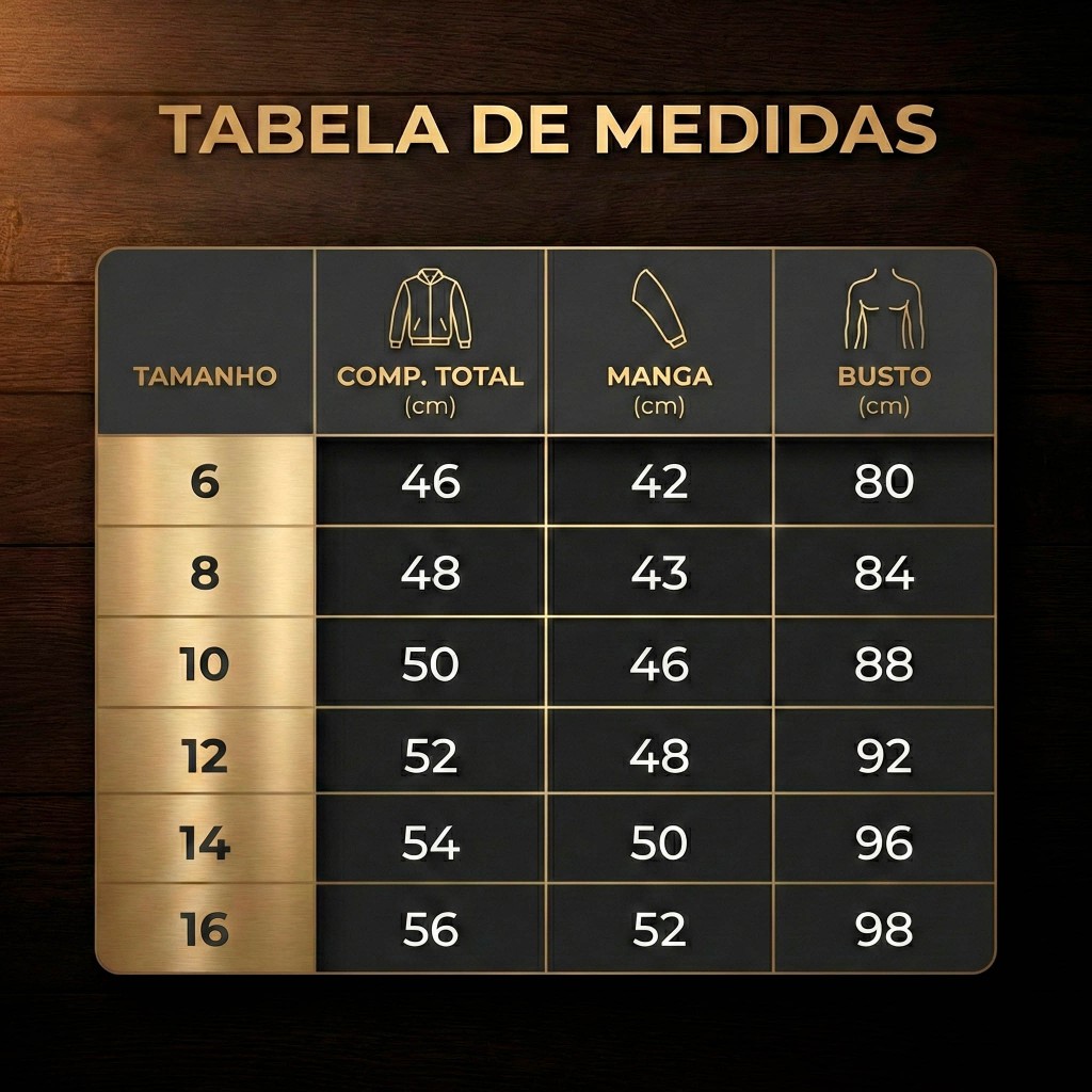 Jaqueta de Couro com Forro Interno Peluciada Premium Verificar Medidas Com certeza! Aqui está o texto pronto para você copiar e colar na sua descrição, organizado com marcadores para ficar bem legível e profissional: Tabela de Medidas Tamanho 06 Comprimento Total: 46 cm Manga: 42 cm Busto: 80 cm Tamanho 08 Comprimento Total: 48 cm Manga: 43 cm Busto: 84 cm Tamanho 10 Comprimento Total: 50 cm Manga: 46 cm Busto: 88 cm Tamanho 12 Comprimento Total: 52 cm Manga: 48 cm Busto: 92 cm Tamanho 14 Comprimento Total: 54 cm Manga: 50 cm Busto: 96 cm Tamanho 16 Comprimento Total: 56 cm Manga: 52 cm Busto: 98 cm
