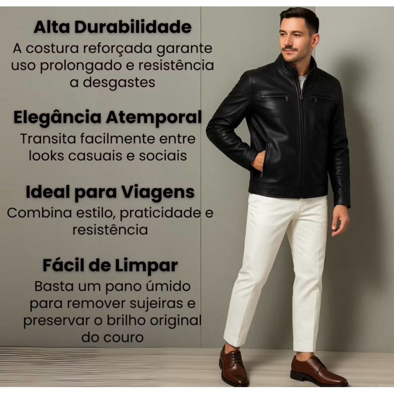 Aposte no estilo e conforto com nossa Jaqueta Masculina de Couro Sintético Moderna! Confeccionada em material de alta qualidade, ela traz o visual sofisticado do couro com toda a praticidade do sintético, ideal para o dia a dia ou ocasiões especiais. Possui acabamento premium, corte ajustado ao corpo (slim fit) e fechamento em zíper resistente, além de gola alta que oferece um toque extra de elegância. Perfeita para dias mais frios, combina facilmente com calças jeans, camisetas ou camisas sociais. Estilo urbano, conforto garantido e ótima durabilidade! Características: • Material: Couro sintético ecológico • Modelo: Slim Fit (ajustado ao corpo) • Fechamento: Zíper de alta qualidade • Estilo: Casual, moderno, urbano • Ideal para outono, inverno e meia-estação • Fácil de limpar e manter Tamanhos disponíveis: P | M | G | GG | XG (verifique a tabela de medidas) Dica de uso: Combine com tênis, botas ou sapatos sociais para criar looks variados — do casual ao mais elegante!
