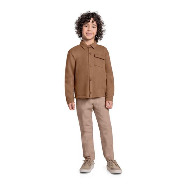 Shacket infantil para menino, uma peça versátil que combina o estilo de uma camisa com o conforto de uma jaqueta. Confeccionada em moletom diagonal flamê, proporciona um toque macio e aconchegante. Possui gola social clássica, fechamento por botões e um bolso com lapela, adicionando um charme extra ao visual. Ideal para composições modernas e cheias de atitude.Tecido: Moletom diagonal flamêComposição: 100% algodãoModelagem: JustaComprimento Mangas: LongaForro: NãoDecote/Gola: Gola socialFechamento: BotõesInformações Extras: Possui estampa lisa