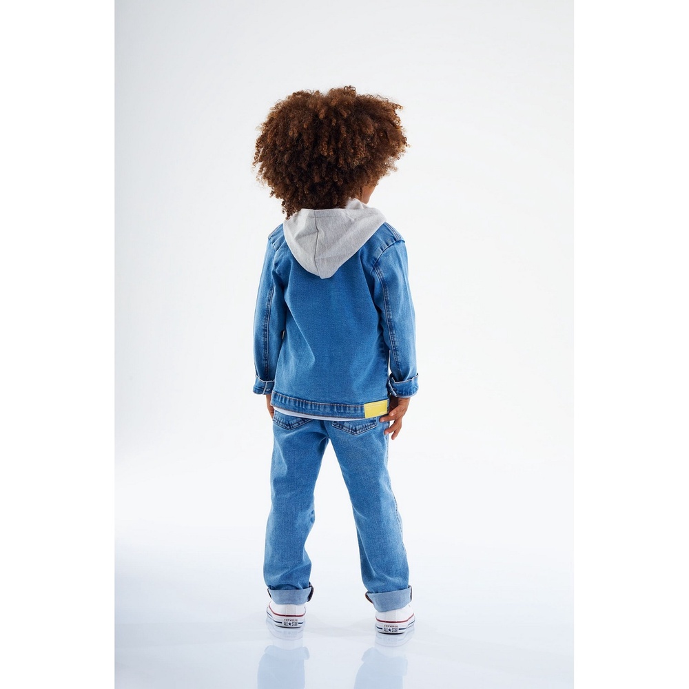 Jaqueta infantil masculina produzida em jeans com elastano, que aumenta a durabilidade da peça, além de favorecer a secagem. A peça possui capuz removível, gola com pesponto simples, pesponto simples que simula bolsos, barra, punhos e abertura com botões. Peça muito estilosa, que com toda certeza vai ficar perfeita no seu pequeno.Fechamento: BotõesTecido: JeansComposição: 98%algodão 2%elastano Capuz:70%algodão 30%poliésterDecote/Gola: Em VModelagem: JustaForro: NãoComprimento da Manga: Longa