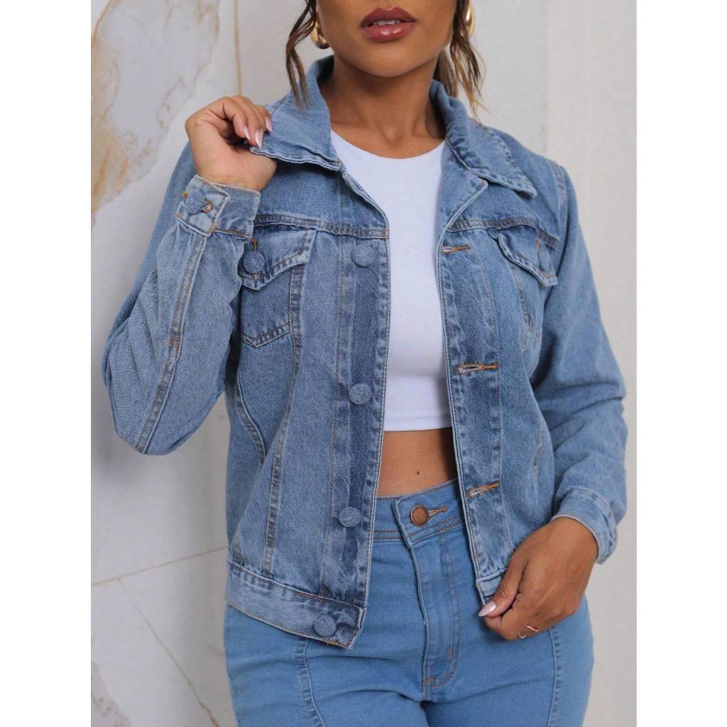 Jaqueta Jeans Feminina casaco manga longa Lavagem Clara botao ferro