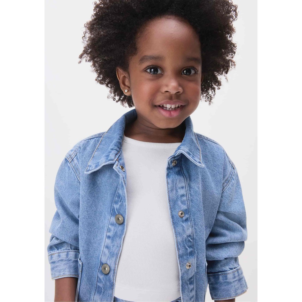 Jaqueta jeans infantil com modelagem cropped. Possui comprimento abaixo na cintura, abertura frontal com botões e caseado, cavas deslocadas, mangas compridas e bolsos sobrepostos funcionais. Detalhes da peça:Em jeansModelagem croppedCavas deslocadasBolsos funcionais