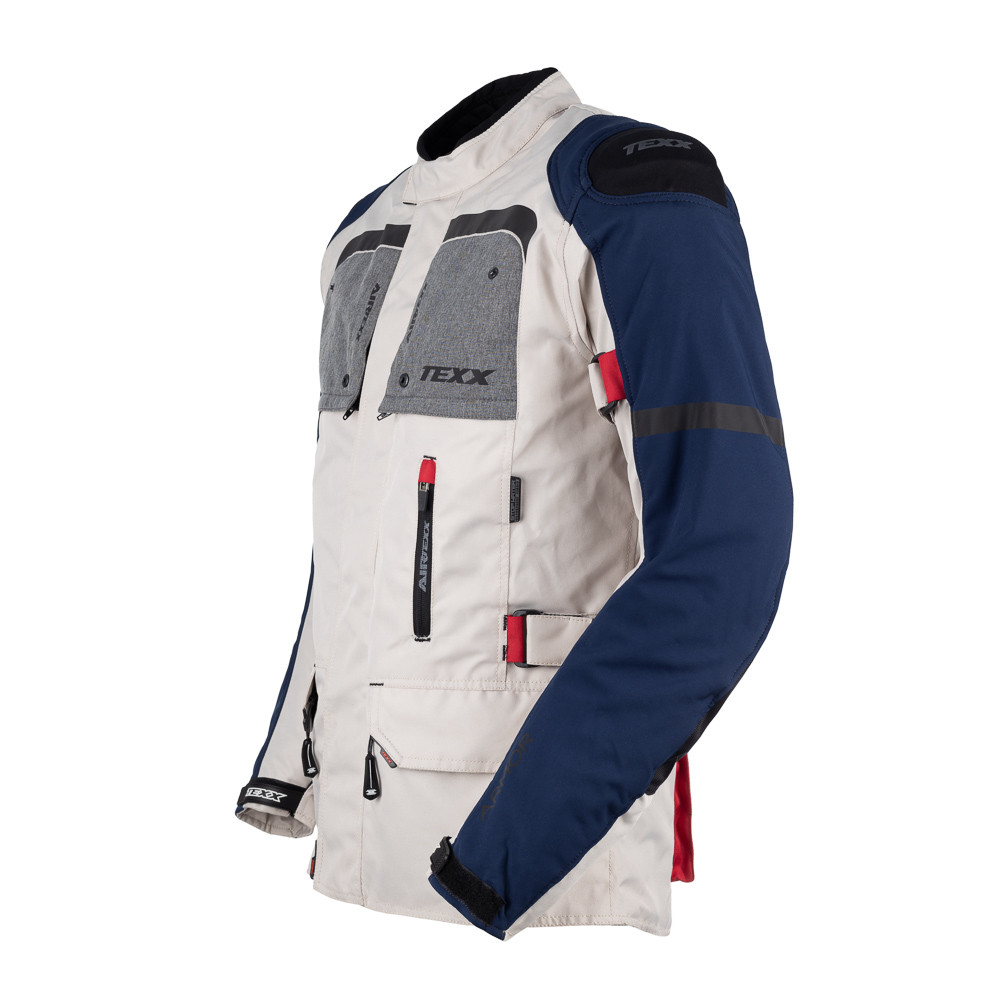 JAQUETA ARMOR A jaqueta impermeável TEXX Armor é uma parca ideal para viajar. Extremamente segura e confortável, seus protetores CE, forro térmico integral removível e entradas de ar a tornam adequada para as mais variadas condições climáticas. DESCRIÇÃO DO PRODUTO CONSTRUÇÃO • Jaqueta produzida em poliéster 600D de alta resistência a abrasão e conforto; • Costura dupla para maior resistência; • Gola com acabamento em Neoprene evitando irritação da pele; • Painel de tecido 1680D nos cotovelos para maior segurança; • Protetores de ombros externos produzidos em poliuretano; TECNOLOGIA •Novos refletivos Dark com tecnologia SHINE TEXX, muito mais discretos e com efetividade maior; • Novo sistema de ventilação AirTexx com grandes painéis de entrada de ar frontais; • Protetores EVOLUTION TEXX removíveis nos ombros e cotovelos e costas; • Forro com acabamento MFI TEXX (Micro Fibra Inteligente), tornando o tecido antialérgico e antibacteriano; • Sistema STOPWATER® (resistente à água); CONFORTO • Tecido elástico nas costas para melhor conforto na pilotagem; DESIGN • Design com tecido especial, trazendo elegância e estilo para a jaqueta; • Ajuste velcro cintura; • Detalhes exclusivos; • Bolsos internos impermeáveis; • Bolsos frontais externos com fechamento em zíper; • Zíper impermeável nas entradas e saídas de ar; AJUSTES • Loop de acoplagem com calças; • Ajuste prático no punho com velcro – facilidade para colocar luvas; CERTIFICAÇÃO • Nível – CE (Conformidade Europeia);