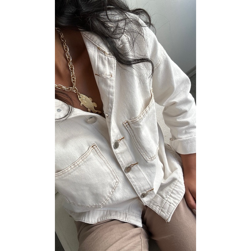 Esta é a versão mais sofisticada e estilosa da nossa Jaqueta de Sarja! O modelo se destaca pelo charme do tecido Off White (Quase Branco/Cru) e os detalhes de costura em cor de linha contrastante (bege/caramelo), que trazem um visual único e valorizam a modelagem. • Cor: Off White (Um branco mais suave, que não é transparente e é super elegante). • Detalhe Único: Costura aparente (como no jeans) na cor de linha em contraste. • Fechamento: Botões metálicos/prateados no estilo clássico. • Modelagem: Overshirt/Jaqueta Estilo Camisa. Possui a barra arredondada (mullet) nas laterais/costas, que alonga a silhueta. • Manga: Possui o comprimento ideal para ser usada dobrada (como na foto) para um visual mais despojado. 🧥 Características e Estilo A Jaqueta de Sarja é a terceira peça perfeita para transformar seus looks. • Tecido Premium: Sarja de alta qualidade, macia e com ótimo caimento. • Caimento: Modelagem Oversized (soltinha), ideal para usar aberta com croppeds, tops canelados ou regatas. • Versatilidade: Perfeita para qualquer estação. Combina com shorts (como na foto), jeans, saias e vestidos. Um verdadeiro coringa!