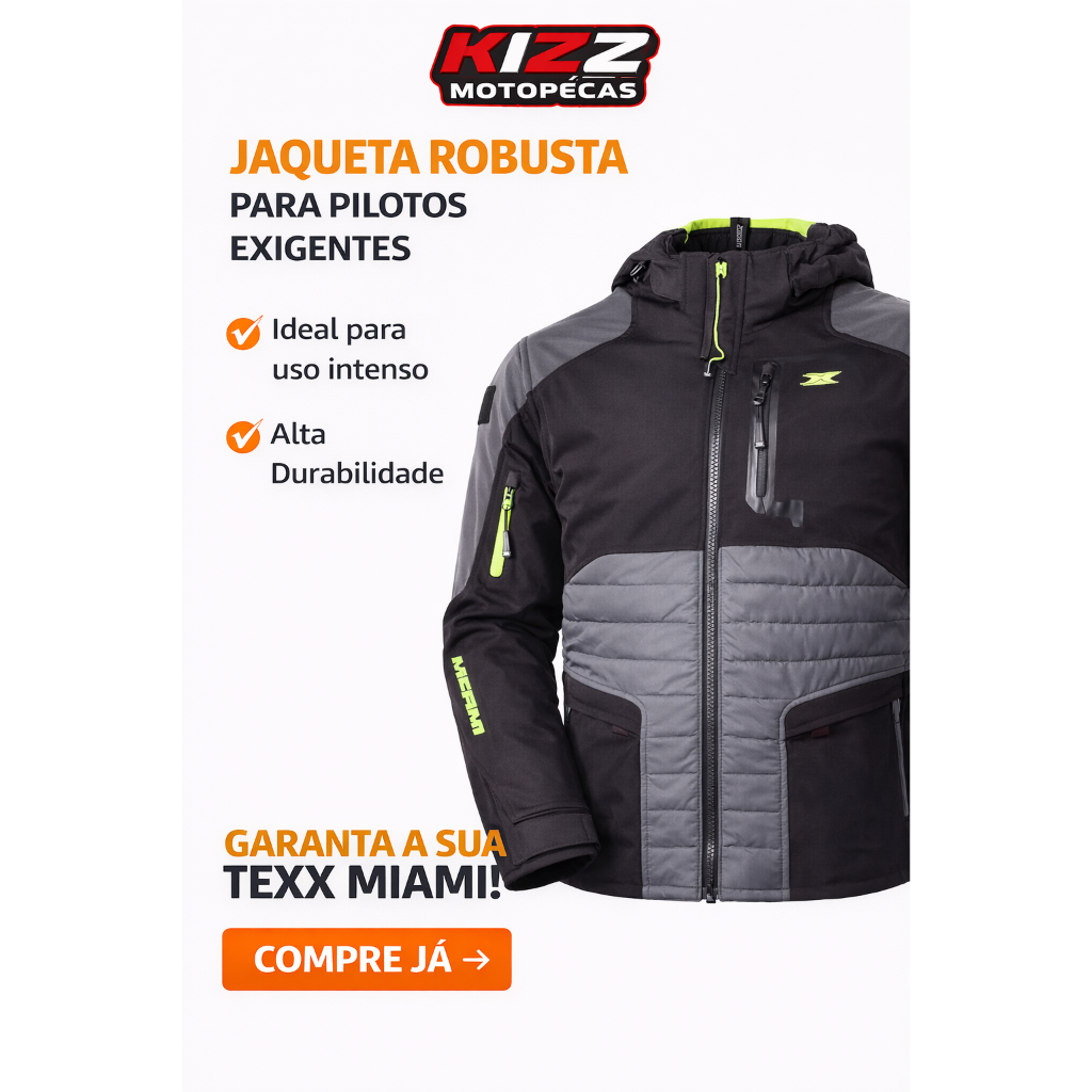 JAQUETA TEXX MIAMI A Jaqueta Texx Miami é ideal para motociclistas urbanos que buscam proteção real, conforto térmico e versatilidade no dia a dia. Conta com protetores removíveis nível 2, forro térmico e design moderno para uso diário, sem abrir mão da segurança. Com estilo moderno e repleta de funcionalidade a Miami possui touca removível costura dupla. 💨 Indicada para: ✔ Uso urbano diário ✔ Clima ameno a frio ✔ Dias frios com forro térmico ✔ Clima variável ❌ Não indicada para: ✖ Chuva intensa contínua ✖ Uso extremo off-road DESCRIÇÃO DO PRODUTO CONSTRUÇÃO • Jaqueta produzida em Neoprene e poliamida; • Forro interno produzido em poliéster; • Costura dupla para maior resistência; • Gola com acabamento em Neoprene; TECNOLOGIA • Resistente à água; • Protetores Evolution internos removíveis emborrachados nível 2 nos ombros e cotovelos; • Protetor Evolution removível nas costas; • Sistema Thermal Lining (forro térmico interno); • Sistema MFI (Micro Fibra Inteligente) acabamento com íons de prata capaz de evaporar o suor e a umidade sendo ainda antifúngico e antialérgico; • Sistema AIRTEXX de ventilação nos braços; • Zíper YKK. CONFORTO • Neoprene aplicado em partes ergonômicas e de maior movimentação; • Corte ergonômico; DESIGN • Linha casual desenvolvida pensada em tendências mundiais no Mundo do motociclismo com materiais de primeira linha; • Jaqueta com dupla aplicação de materiais (Neoprene casual + puffer); • Logo emborrachada nos braços; • 2 bolsos frontais; • Smart pocket bolso para cartão/documento no braço; • Touca removível; • Imã na parte traseira para touca não se movimentar durante a pilotagem; • Laços de acoplagem para calças; • Disponível nas cores: Preta e verde / Azul e verde / Preta e cinza. AJUSTES • 2 ajustes na touca; • Ajuste em velcro no punho;