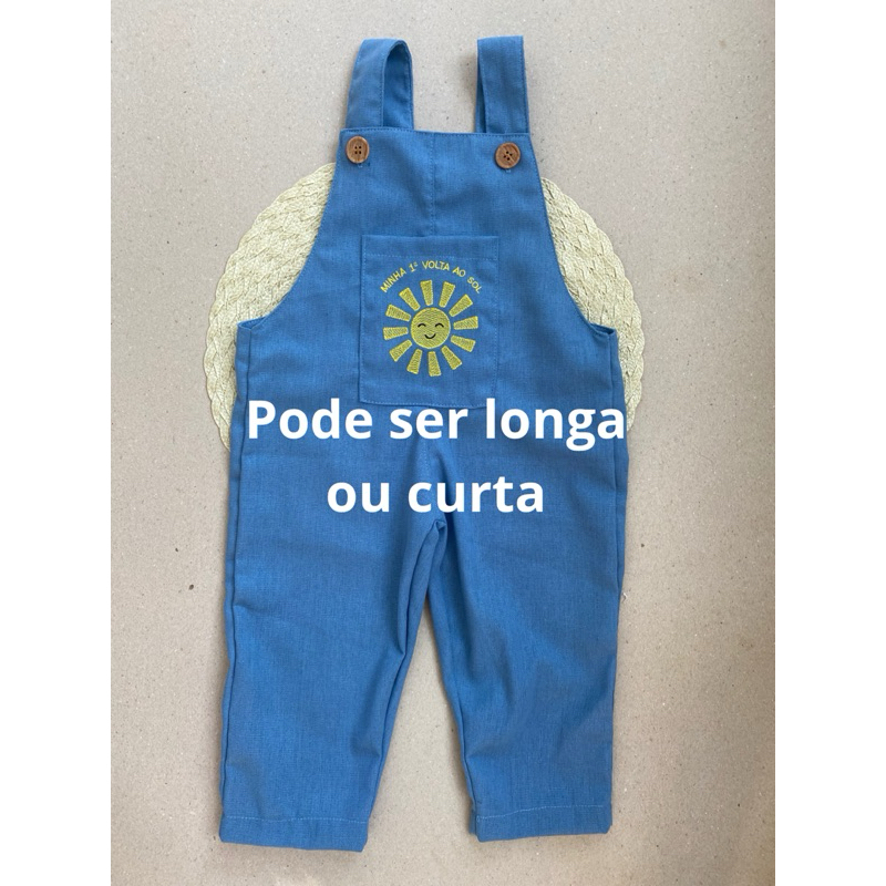 jardineira confeccionada em tecido de linho misto, com botões nas alças, e bordado na parte frontal. a personalização da jardineira pode ser feita alterando o bordado do bolso da jardineira, não fazemos bordados além do bolso. consulte se terá o tema escolhido antes de efetuar a compra. consulte as cores de tecido disponível para fazer o pedido. Nos envie o tema no chat assim que fizer o pedido, caso não nos avise enviaremos a jardineira sem bordado todo o contato é feito pelo chat pedido por encomenda, prazo de 6 a 8 dias úteis para confecção, se atentem a data que irá utilizar.