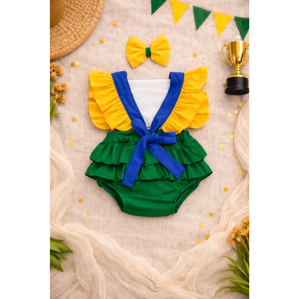 Jardineira Copa do Mundo Roupa Menina Bebê Tricoline 100% Algodão Body Macacão Brasil