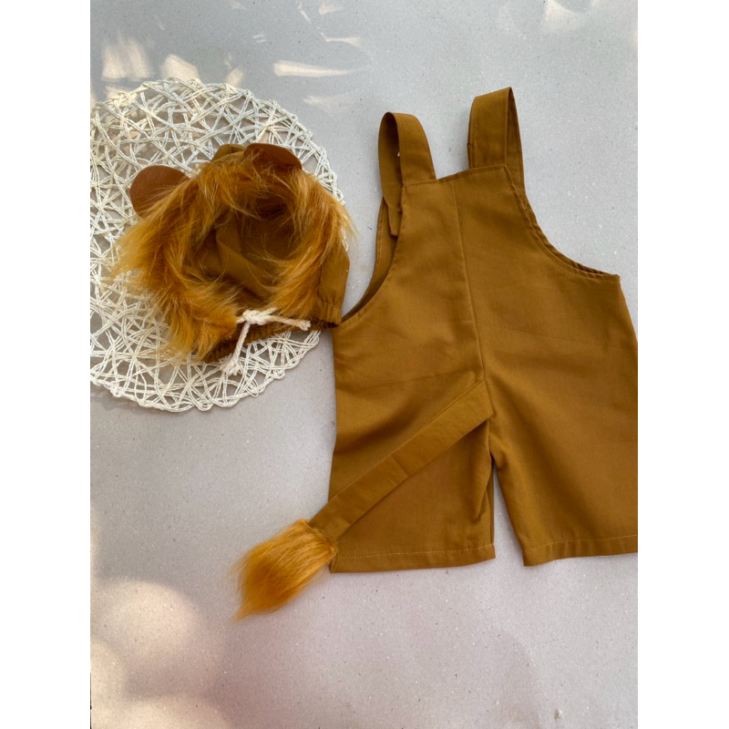 kit contendo jardineira + touca confeccionado em tecido de sarja leve 100% algodão. jardineira com detalhe frontal da barriguinha e rabo com pelinho atrás, fechamento com botões. touca com orelhinhas e juba com pelinho. perfeito para fotos com tema Safari ou leão mesmo. atenção ao prazo de produção !!!