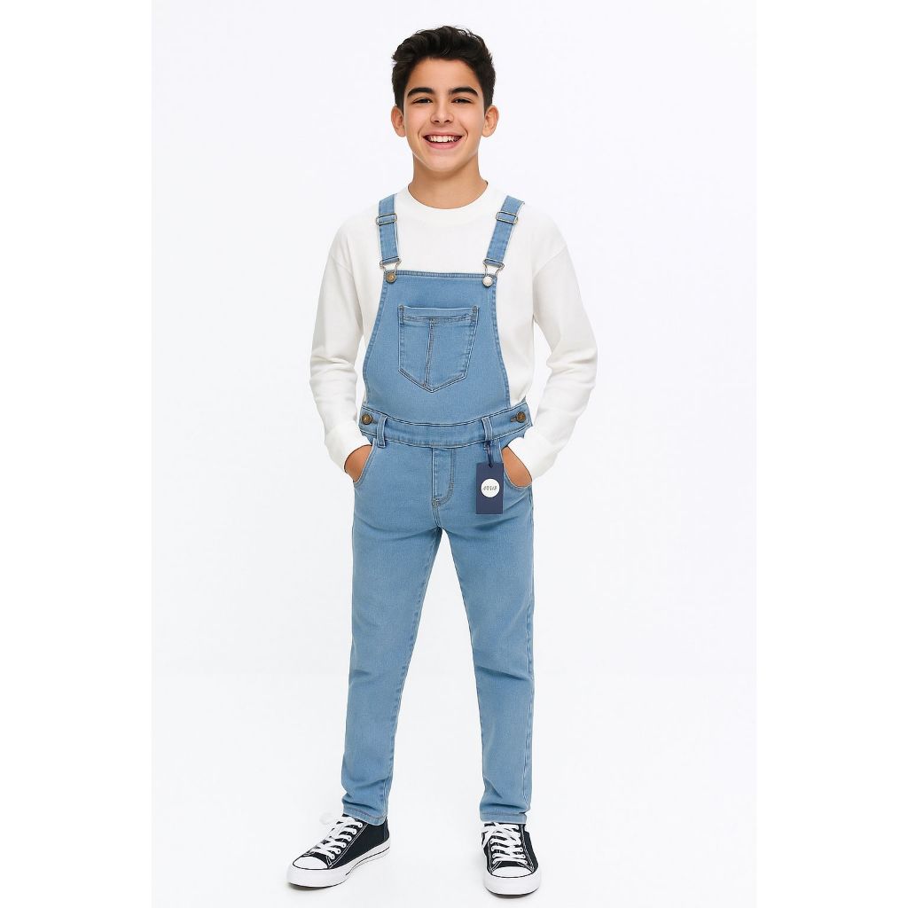 jardineira menino jeans com elastano de 10 a 16 anos na cor clara com bolsos Laterais na frente e atrás fechamento com botões alças são regulável qualquer dúvida chama no chat 💬