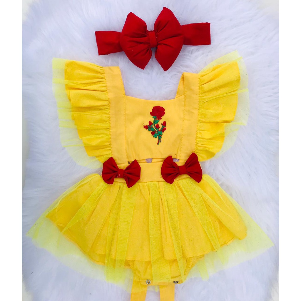 Jardineira Romper Saia Body Salopete Conjunto de Menina Mesversario Fantasia Bela e a Fera Amarelo