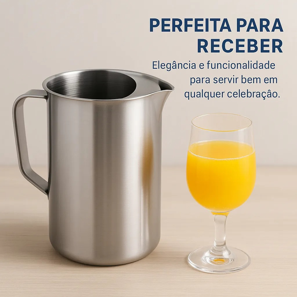 🧊 Jarra de Aço Inox 1,8L com Aparador de Gelo Design moderno, funcionalidade e durabilidade em um só produto Sirva suas bebidas com mais elegância, praticidade e eficiência no dia a dia. A Jarra de Aço Inox 1,8 Litros com Aparador de Gelo foi desenvolvida para quem busca qualidade superior, visual sofisticado e ótimo desempenho ao servir. Ideal para água, sucos, chás, drinks e bebidas geladas, ela mantém a bebida fria por mais tempo, evitando que o gelo caia no copo e dilua o sabor. 🍹❄️ ✨ Principais Características: 🧊 Aparador de gelo interno Separador embutido que impede a saída do gelo, garantindo bebidas sempre geladas sem alterar o sabor. ✨ Design moderno e sofisticado Acabamento em inox que valoriza a mesa e combina com cozinhas modernas, buffets, bares e restaurantes. ✋ Alça ergonômica Pegada firme e confortável, oferecendo mais segurança e estabilidade ao servir. 🛡️ Material premium Produzida em aço inoxidável de alta durabilidade, resistente à corrosão, manchas e odores. 📏 Capacidade ideal – 1,8 litros Perfeita para reuniões, festas, uso familiar, escritórios e ambientes profissionais. ✅ Benefícios: ✔ Mantém as bebidas frias por mais tempo ✔ Evita que o gelo caia no copo ✔ Fácil de limpar e altamente resistente ✔ Visual elegante que traz requinte à mesa ✔ Ideal para servir várias pessoas sem reabastecer com frequência 📐 Especificações Técnicas: Material: Aço inoxidável Capacidade: 1,8 litros (1800 ml) Dimensões aproximadas: 13 cm (diâmetro) x 24 cm (altura) Cor: Inox prateado Tampa: Com aparador de gelo embutido Indicação de uso: Água, sucos, chás, drinks e bebidas geladas ⚠️ Cuidados e Observações: Não levar ao fogo ou ao micro-ondas Evite produtos abrasivos para preservar o brilho do inox Armazene em local seco após o uso