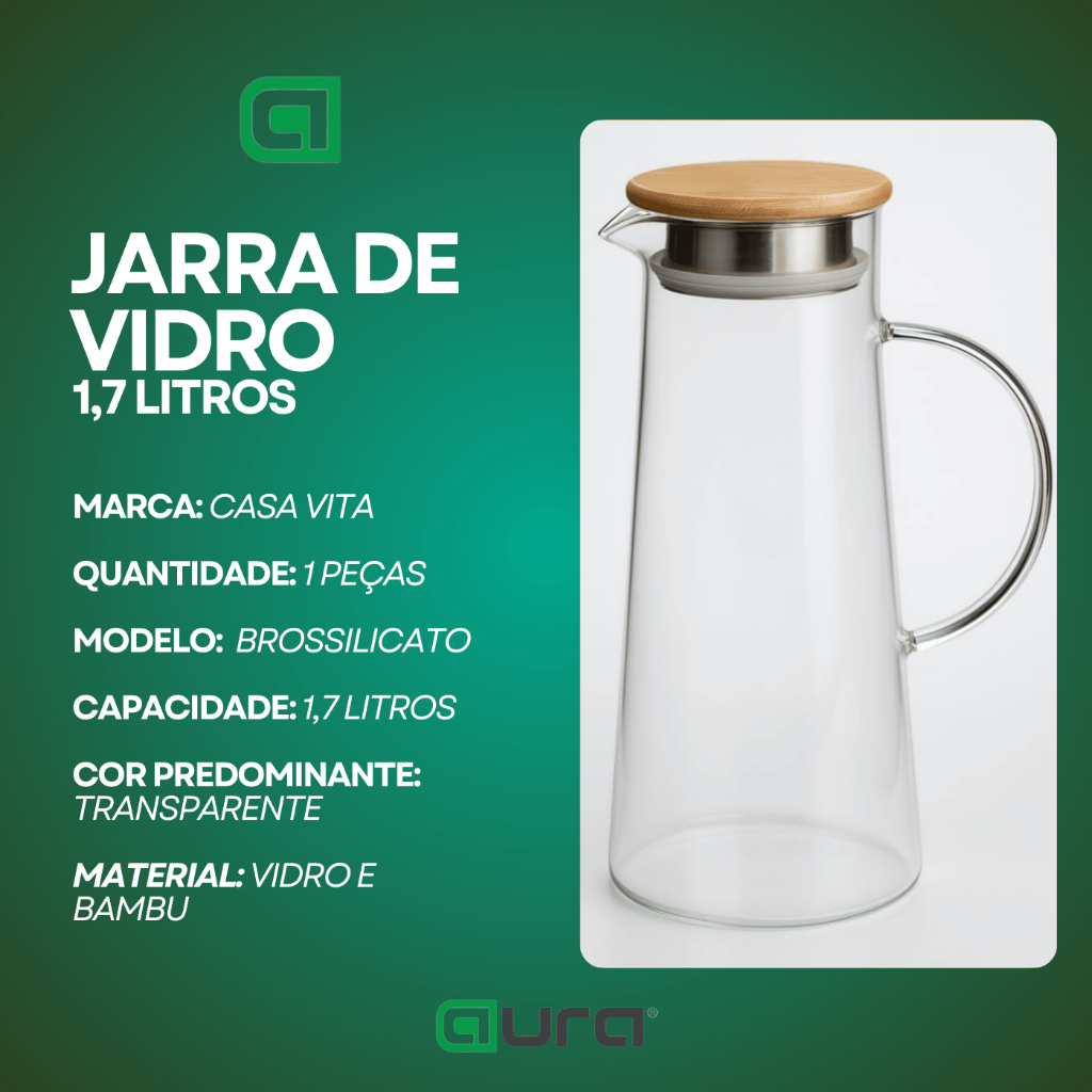 Jarra de Vidro 1,7L Borossilicato Transparente com Tampa Bambu