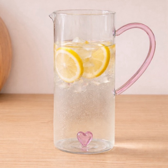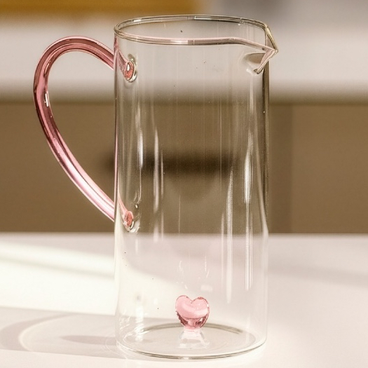 Jarra de vidro rosa com coração e alça 1350 ml de borossilicato de suco chá transparente mesa posta cozinha fofa garrafa