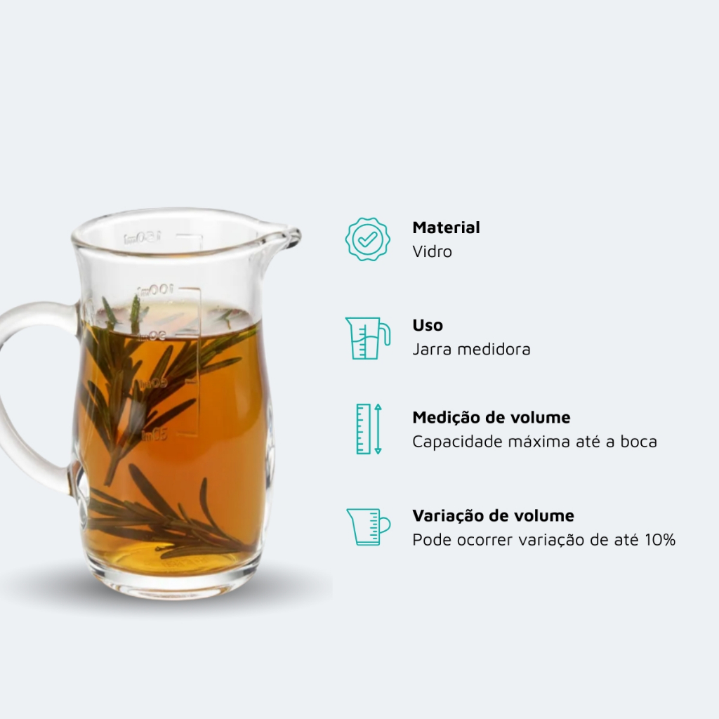 Jarra Medidora de Vidro 170ml Uso Culinário Drinks Receitas Ruvolo Medições imprecisas comprometem receitas, drinks e preparos do dia a dia. A Jarra Medidora de Vidro 170ml Ruvolo foi desenvolvida para garantir controle de volume em pequenas quantidades, oferecendo precisão, praticidade e fácil manuseio tanto em cozinhas residenciais quanto profissionais. Benefícios Principais Fabricada em vidro, a jarra proporciona leitura clara e uso confiável para medições líquidas. Sua capacidade de 170ml atende preparos que exigem precisão em pequenas quantidades. O formato compacto facilita o manuseio, armazenamento e uso contínuo, tornando o produto funcional para a rotina culinária e preparo de bebidas. Compatibilidade e Aplicação Indicada para medições de líquidos no preparo de receitas, drinks e bebidas. Adequada para uso doméstico e profissional. Especificações Técnicas Uso: Jarra medidora Material: Vidro Capacidade: 170ml Diâmetro: 65mm Altura: 110mm Observações: • Capacidade medida com o volume máximo até a boca • Diâmetro considerado pela maior largura da peça • Pode haver variação de até 10% no volume Itens Inclusos 1 Jarra Medidora de Vidro Adicione precisão e praticidade ao seu preparo diário com uma jarra medidora funcional, compacta e pronta para uso imediato. Ruvolo A Ruvolo é uma empresa especializada na produção de copos, taças, canecas e outros produtos de utilidade doméstica em vidro e cristal, oferecendo itens funcionais, resistentes e com design pensado para o uso diário. Trabalha com produtos voltados para praticidade, organização e apresentação, atendendo tanto o uso doméstico quanto opções para presente, sempre com foco em qualidade e bom acabamento. Há mais de 100 anos no mercado, a Ruvolo traz excelência e qualidade para a sua mesa. Pensou em vidro, pensou em Ruvolo.