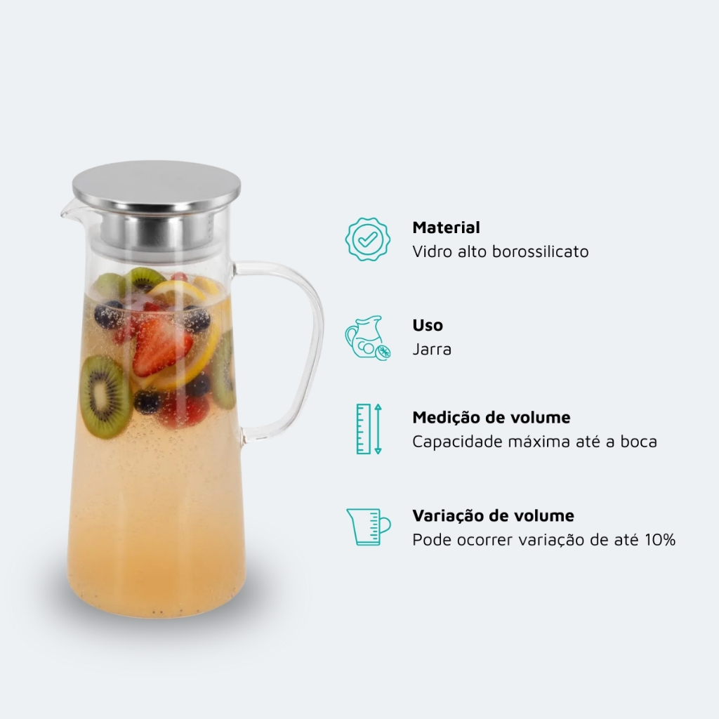 Jarra Vidro Borossilicato Brisa Uso Diário Tampa Inox 1400ml Ruvolo
