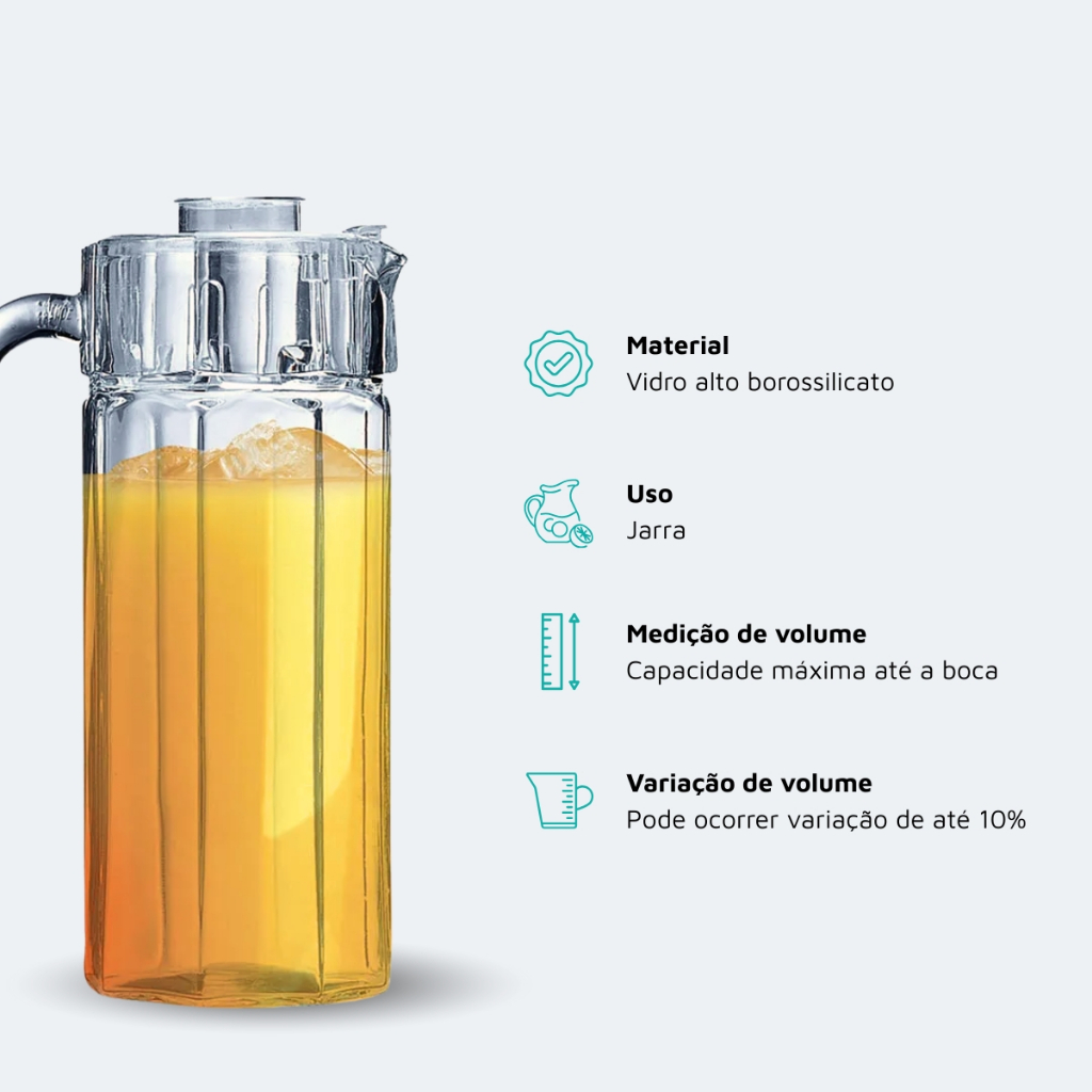 Jarra Vidro Octime Tampa Suco Água Chá Bebidas Geladeira Escritório Resistente 1,6L Ruvolo Servir e armazenar bebidas na geladeira muitas vezes resulta em perda de frescor ou absorção de odores devido à falta de tampas adequadas. A Jarra Octime Ruvolo resolve esse problema com um design octogonal moderno e uma tampa ajustada, garantindo a proteção do líquido, prevenção de vazamentos e otimização do espaço na porta da geladeira. Benefícios Principais Esta jarra destaca-se pela sua construção em vidro de alta qualidade e transparência, valorizando a apresentação de sucos e águas aromatizadas. A tampa inclusa é um diferencial essencial para a higiene e conservação das bebidas. Seu formato octogonal não apenas oferece uma estética contemporânea, mas também facilita a pega segura. Com capacidade de 1,6L, atende perfeitamente ao uso doméstico e corporativo, sendo uma peça durável que não retém cheiros ou manchas. Compatibilidade e Aplicação Produto indicado para servir e armazenar bebidas frias. Compatível com sucos, água, chás gelados, refrigerantes, drinks e águas saborizadas. Ideal para uso em casa (cozinha, sala de jantar) e escritórios (salas de reunião). A higienização deve ser manual com esponja macia. Não é empilhável. Especificações Técnicas • Produto: Jarra com Tampa • Modelo: Octime • Marca: Luminarc • Material: Vidro • Capacidade: 1,6L (Volume máximo até a boca) • Altura: 232mm • Diâmetro: 112mm (Medido pela largura maior da peça) • Origem: China • Variação Volumétrica: Pode sofrer variação de até 10% do volume nominal Itens Inclusos 1 Jarra de Vidro Octime com Tampa 1,6L Ruvolo Estilo e funcionalidade ao servir suas bebidas com a qualidade internacional Luminarc. Adquira agora a Jarra Octime e garanta frescor por mais tempo. Ruvolo A Ruvolo é uma empresa especializada na produção de copos, taças, canecas e outros produtos de utilidade doméstica em vidro e cristal, oferecendo itens funcionais, resistentes e com design pensado para o uso diário. Trabalha com produtos voltados para praticidade, organização e apresentação, atendendo tanto o uso doméstico quanto opções para presente, sempre com foco em qualidade e bom acabamento. Há mais de 100 anos no mercado, a Ruvolo traz excelência e qualidade para a sua mesa. Pensou em vidro, pensou em Ruvolo.
