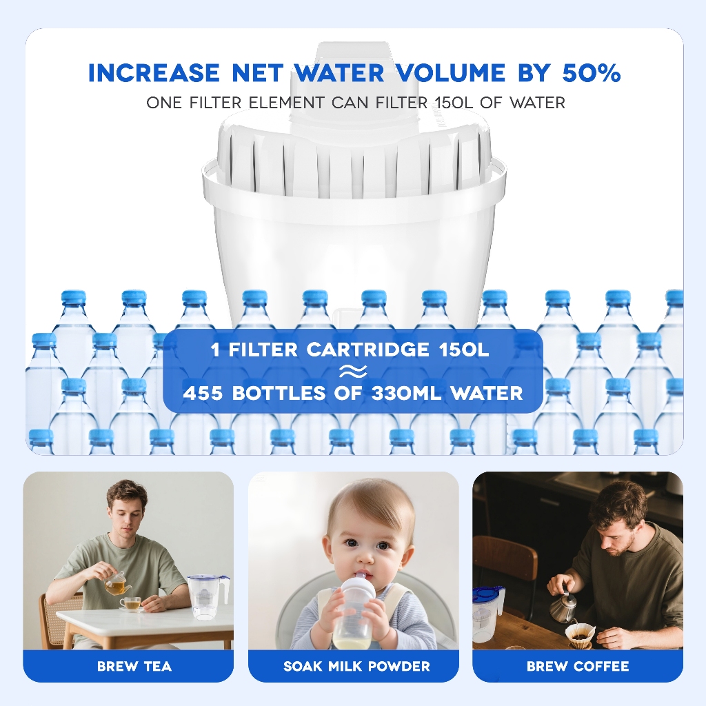 Nome do produto: Jarro purificador de água de 4,2 L Peso do produto: 1,06 kg Dimensões do produto: 28 * 26 * 16 cm Temperatura adequada da água: 4–38 °C Capacidade do jarro: 4,2 L Capacidade do filtro: 2,3 L Capacidade total de filtragem: 150 L Fonte de água adequada: água da torneira municipal Materiais do cartucho do filtro: carvão ativado impregnado com prata, resina de troca iônica, fibra PP fundida. Reduz impurezas, cloro residual, calcário e outras substâncias nocivas na água, melhorando o sabor. Entrada de água com fechamento automático. Bico com ligar/desligar automático. Substituição rápida do cartucho em 5 segundos. Não pode filtrar água quente. A temperatura da água deve ser mantida abaixo de 38 °C.