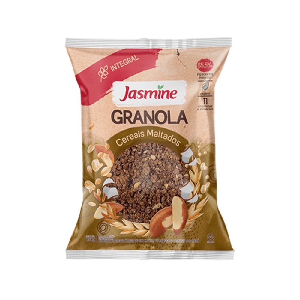 Granola Integral Cereais Maltados 250g Jasmine A granola Jasmine foi a primeira a ser lançada no mercado Brasileiro, prezando pelos seus benefícios e saudabilidade. Com grande quantidade de cereais integrais, as Granolas Jasmine são ricas em fibras reguladoras da função intestinal, além de possuírem 10 vitaminas e minerais, enriquecendo o seu valor nutricional. É integral, vegan e uma explosão de sabores. Ingredientes: Flocos de aveia integral, extrato de malte, flocos de cereais, óleos vegetais (milho e/ou girassol e /ou algodão e/ou palma), flocos de milho integral, fibra de trigo, castanha-do-Pará, uva-passa, coco, mix de vitaminas e minerais (cálcio, vitaminas C, B3, E, zinco, vitaminas B2, B6, B1, B5, A e D), gergelim, aroma e antioxidante natural tocoferol. ALÉRGICOS: CONTÉM AVEIA, CASTANHA-DO-PARÁ E DERIVADOS DE TRIGO E DE CEVADA. PODE CONTER CENTEIO, AMÊNDOA, AMENDOIM, CASTANHA-DE-CAJU, AVELÃ, MACADÂMIA, NOZ, PECÃ, PISTACHE, PINOLI, CASTANHAS E SOJA. CONTÉM GLÚTEN. O GLÚTEN É PREJUDICIAL À SAÚDE DOS DOENTES CELÍACOS. *Este não é um alimento baixo em valor energético.