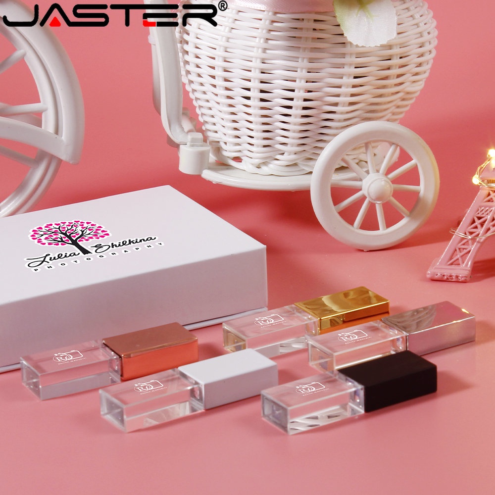 JASTER (1PCS Logotipo Gratuito) Crystal + Box USB 2.0 Flash Drive 128GB Memória Fotográfica De Construção Stick 64GB Pen