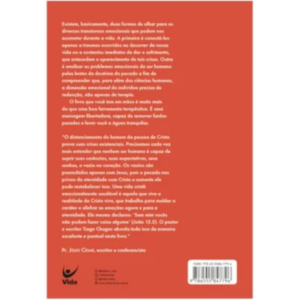 Jesus para ansiosos | Um manual bíblico contra a ansiedade | Tiago Chagas Este livro propõe um olhar além da terapia convencional, abordando os transtornos emocionais sob a luz da doutrina do pecado. Mais que uma ferramenta terapêutica, é uma mensagem de redenção e alívio — um convite à cura profunda e libertadora. Título: Jesus para ansiosos Subtítulo: Um manual bíblico contra a ansiedade Autor: Tiago Chagas Páginas: 112 Capa: Brochura Dimensões: 14 x 21 cm Editora: Vida