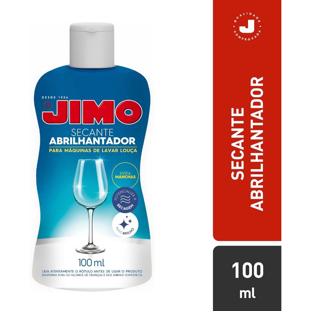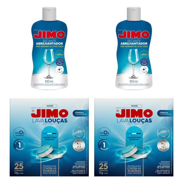 Kit JIMO Lava Louças 2x 25 Pastilhas + 2x Secante Abrilhantador 100ml Descrição: Garanta louças impecáveis com este super kit da JIMO, agora com o dobro de produtos! Ele une limpeza profunda com acabamento brilhante, oferecendo praticidade e eficiência por muito mais tempo. ?? Conteúdo do Kit: 2 caixas com 25 pastilhas JIMO Lava Louças (total: 50 pastilhas) 2 frascos de 100ml de Secante Abrilhantador (total: 200ml) ?? Benefícios: Enzimas e oxigênio ativo que eliminam as sujeiras mais difíceis Proteção para utensílios de inox e metais Evita manchas e promove brilho impecável Alta performance com fórmula concentrada ?? Ideal para quem busca economia e resultados profissionais! ?? Rendimento: 50 lavagens completas com detergente + brilho prolongado com 200ml de abrilhantador.