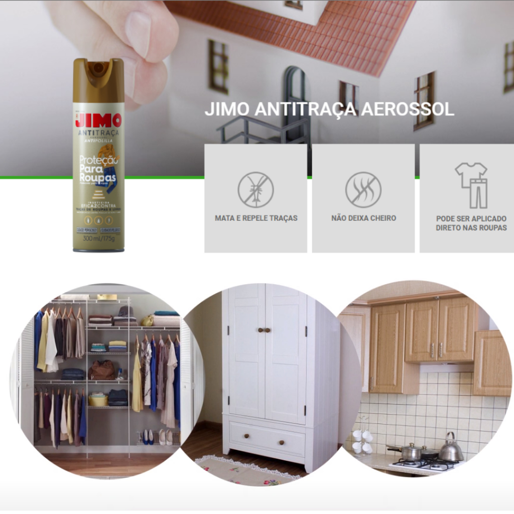 Conteúdo: 1 unidade Spray de 300ml Fabricante: Jimo =================================================================================================== 1. Aplicações: Deve ser aplicado dentro de guarda-roupas (closet), nas prateleiras e gavetas. O produto pode ser também aplicado diretamente sobre as roupas. 2. Características: Jimo AntiTraça Aerossol é um inseticida especialmente desenvolvido para eliminar a traça comum ( Tineola Uterella ) que ataca e destrói as roupas e a traça de livros ( Lepisma Saccharina ) que ataca os livros. Tem ação fulminante no extermínio de traças. O Jimo AntiTraça deve ser aplicado dentro de guarda-roupas ( closet ), nas prateleiras e gavetas. O produto pode ser também aplicado diretamente sobre as roupas. 3. Como Usar: Agite o tubo e pressione a válvula pulverizando Jimo AntiTraça Aerossol no interior de guarda-roupas, estantes, bibliotecas e outros locais de infestação mantendo uma distância de 40 a 60 cm do local a ser tratado por aproximadamente 5 segundos ou mais. Em armários não é necessário a remoção das roupas. Pode ainda ser aplicado nas paredes laterais e fundos dos guarda-roupas e estantes. Quanto ao intervalo de aplicação em armário e gaveta de roupas, recomenda-se fazer regularmente a cada 30 ou 60 dias conforme o grau de infestação. 4. Mais Informações: Atenção: Não aplicar sobre superfícies de cobre ou suas ligas pois pode descolorir as mesmas. Ao aplicar sobre roupas mantenha a distância mínima de 50 cm e faça um teste prévio de compatibilidade em uma área escondida para verificar a fixação de cores.