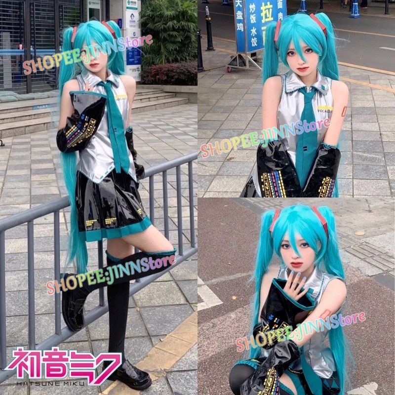 - JINN-MIKU Cosplay HATSUNE Vestido De Couro Patenteado + Wig Set Mulher Papel De Festa De Carnaval
