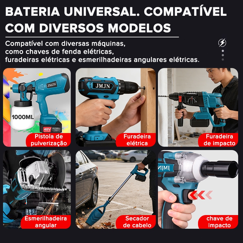 🔋 Bateria 48V Recarregável Alta Capacidade Potência Estável • Mais Autonomia • Uso Profissional Se você procura desempenho real, esta bateria foi feita para você. Não é apenas mais uma bateria “48V” do mercado — é uma solução mais forte, mais durável e mais confiável. ⚡ 48V REAIS COM 10 CÉLULAS DE LÍTIO Enquanto muitas baterias anunciam 48V utilizando apenas 5 células, este modelo conta com: ✅ 10 células de lítio reais ✅ 1200mAh por célula (1200mAh × 10) ✅ Energia mais estável e contínua 👉 Mais células = mais autonomia, menos queda de potência e maior vida útil. 🔄 Por que esta bateria é diferente? Baterias comuns com menos células costumam apresentar: Queda rápida de energia Aquecimento excessivo Menor durabilidade ao longo do tempo Esta bateria foi projetada para entregar: 🔹 Uso prolongado sem perda de força 🔹 Desempenho estável em equipamentos de maior demanda 🔹 Menos ciclos de recarga 🔹 Maior segurança no uso diário 💡 Ideal para quem utiliza ferramentas elétricas com frequência. 🔧 Compatível com Ferramentas Tipo DeWALT Interface compatível com ferramentas a bateria padrão DeWALT Encaixe firme e seguro Fácil de instalar e remover ⚠️ Atenção: Antes da compra, confirme se o encaixe do seu equipamento é compatível com este padrão. Diferentes modelos podem ter requisitos específicos de potência e conexão. 🚿 Pode ser usada em lavadoras portáteis? ✔️ Pode ser utilizada em lavadoras portáteis compatíveis com bateria tipo DeWALT ✔️ Indicada para equipamentos que exigem energia estável e contínua ⚠️ Não garantimos compatibilidade com todos os modelos do mercado. Verifique o tipo de encaixe antes da compra. 💰 Mais barata ou mais vantajosa? Uma bateria mais barata pode parecer atrativa no início, mas geralmente: Dura menos Entrega menos potência Precisa ser substituída mais rápido 👉 Investir em 10 células reais significa comprar uma vez e usar por muito mais tempo. Mais caro no preço, mais econômico no uso. 📦 Especificações Técnicas 🔋 Voltagem: 48V 🔋 Tipo: Bateria Recarregável de Lítio 🔋 Capacidade: 10 células (1200mAh × 10) 🔋 Aplicação: Ferramentas elétricas / Lavadoras portáteis compatíveis 🔋 Uso: Doméstico e profissional ✅ Ideal para quem: ✔ Usa ferramentas elétricas com frequência ✔ Precisa de mais autonomia e estabilidade ✔ Não quer trocar bateria o tempo todo ✔ Prefere investir em qualidade