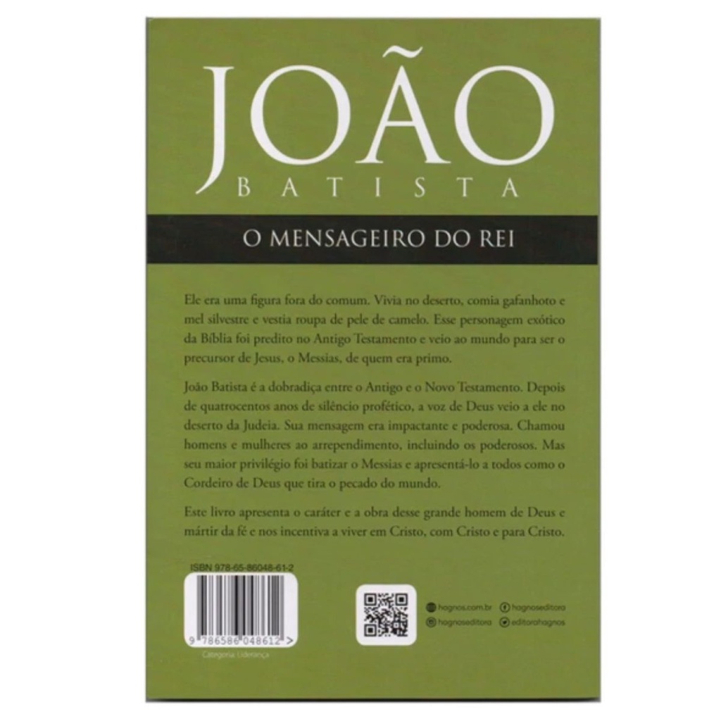 Ele era uma figura fora do comum. Vivia no deserto, comia gafanhoto e mel silvestre e vestia roupa de pele de camelo. Esse personagem exótico da Bíblia foi predito no Antigo Testamento e veio ao mundo para ser o precursor de Jesus, o Messias, de quem era primo. João Batista é a dobradiça entre o Antigo e o Novo Testamento. Depois de quatrocentos anos de silêncio profético, a voz de Deus veio a ele no deserto da Judeia. Sua mensagem era impactante e poderosa. Chamou homens e mulheres ao arrependimento, incluindo os poderosos. Mas seu maior privilégio foi batizar o Messias e apresentá-lo a todos como o Cordeiro de Deus que tira o pecado do pecado. Este livro apresenta o caráter e a obra desse grande homem de Deus e mártir da fé e nos incentiva a viver em Cristo, com Cristo e para Cristo. Detalhes do Produto: Autor: Hernandes Dias Lopes Editora: Hagnos Acabamento: Brochura Dimensões: 14 larg. X 21 alt. Número de páginas : 128