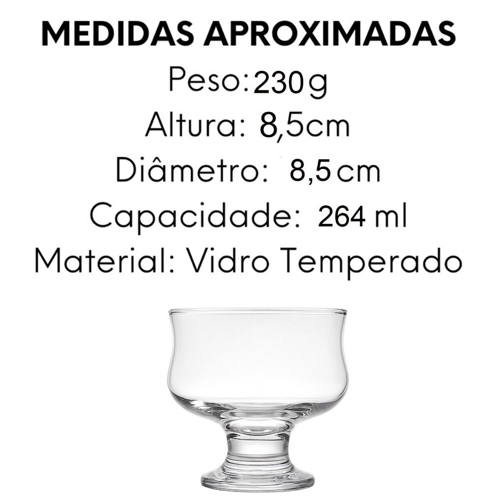 KIT 06 UNIDADES Jogo De Taca De Vidro Para Sobremesa Com 6 Pecas 264Ml Jogo De Taca De Vidro Para Sobremesa Com 6 Pecas 264ml Na Ca Importante - Foto meramente ilustrativa (usada apenas para mostrar os ângulos do produto) Jogo De Taça De Vidro Para Sobremesa Com 6 Pecas 264ml Na Validade: Indeterminada Capacidade: 264ml Tamanho Aproximado Da Taça: 8,5x8,5cm De ø Tamanho Aproximado Da Embalagem: A:9xl:33,5cm Peso Aproximado: 710g Tipo De Produto: Jogo De Taça Para Sobremesa Com 6 Peças Na Caixa Cor: Transparente Composição: Vidro
