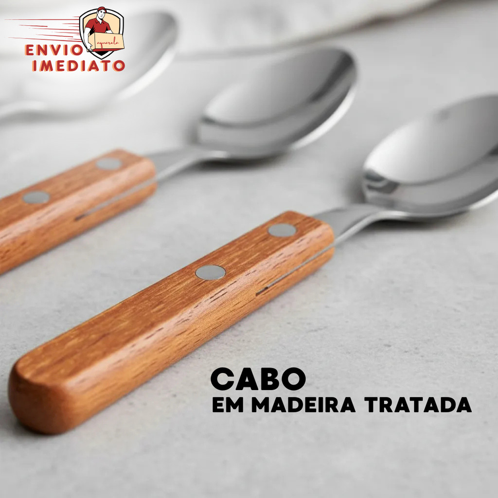 Jogo 12 Colher de Sobremesa Inox Com Cabo Em Madeira Rústico Temático Restaurante Kit Dúzia
