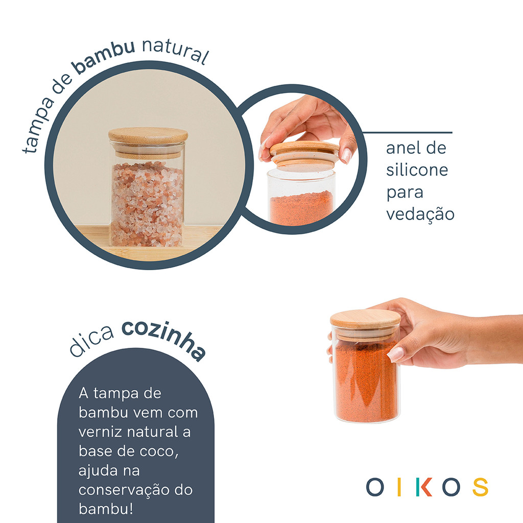 Jogo 12 potes de vidro 250ml com tampa de bambu herméticos para tempero - Oikos