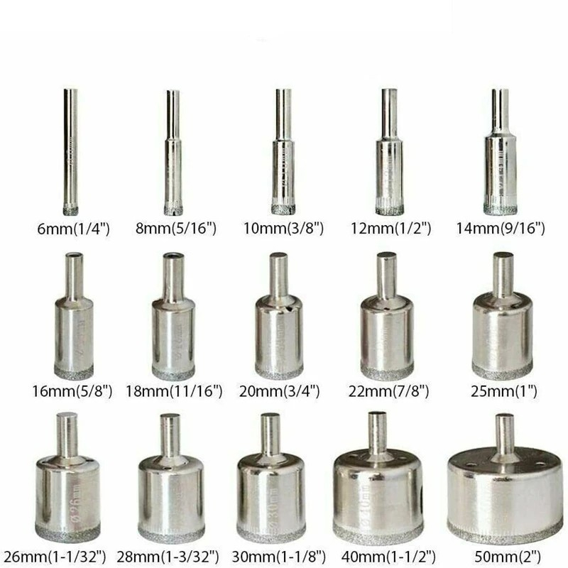 Nome do Produto: Jogo 15 Brocas Diamantadas Serra Copo Vidro Granito Ceramica QS257 CONJUNTO DE 15 PEÇAS DE FERRAMENTAS INTERCAMBIAVEIS PARA FURADEIRA SERRA COPODIAMANTADA Sobre o Produto: Jogo 15 Brocas Diamantadas Serra Copo Vidro Granito Ceramica KIT 15 BROCAS DIAMANTADAS DE 06mm à 50mm. Peças de 15 x Peças Tamanhos: Kit 15 Peças: 6mm, 8mm, 10mm, 12mm, 14mm, 16mm, 18mm, 20mm, 22mm, 25mm,26mm 28mm, 30mm, 40mm, 50mm. Kit 20 Peças: 3mm, 4mm, 5mm, 6mm, 8mm, 10mm, 12mm, 14mm, 16mm, 18mm, 20mm, 22mm, 25mm,26mm 28mm, 30mm, 32mm, 40mm, 50mm.