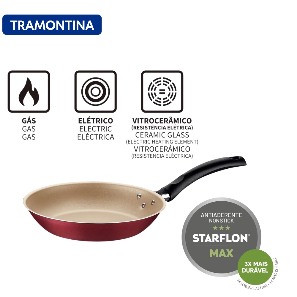 Kit Frigideiras Tramontina Turim Antiaderentes 24 cm e 28 cm + Espátula Tramontina Ability em Nylon Vermelha Eleve sua experiência na cozinha com o kit perfeito para o preparo de pratos deliciosos e saudáveis! O conjunto é composto por duas frigideiras Tramontina Turim em alumínio com revestimento interno e externo antiaderente Starflon Max, nos tamanhos de 24 cm e 28 cm, e uma espátula Tramontina Ability em nylon, ideal para manusear os alimentos com praticidade e segurança. As frigideiras de 24 cm (1,4 L) e 28 cm (2,0 L) são projetadas para garantir o cozimento uniforme dos alimentos, graças ao corpo de alumínio com espessura de 1,2 mm, que distribui o calor de maneira eficiente. O revestimento antiaderente Starflon Max evita que os alimentos grudem, facilitando a limpeza e prolongando a durabilidade do produto. Além disso, o material é totalmente seguro, livre de PFOA, e ideal para quem busca uma cozinha mais prática e saudável. Com cabos de baquelite antitérmico, as frigideiras oferecem segurança no manuseio, mesmo em altas temperaturas. Elas podem ser utilizadas em fogões a gás, elétricos e vitrocerâmicos e são compatíveis com lava-louças, proporcionando ainda mais praticidade no dia a dia. A espátula Tramontina Ability, com design moderno e funcional, é feita de nylon resistente a altas temperaturas (até 180 °C), sendo ideal para o uso em superfícies antiaderentes e cerâmicas, sem arranhar ou danificar os revestimentos. Seu cabo com furo passante permite pendurá-la, facilitando a organização da sua cozinha. Principais características: • Kit composto por frigideiras de 24 cm e 28 cm sem tampa, mais uma espátula de nylon Tramontina Ability. • Frigideiras com revestimento antiaderente Starflon Max: mais durabilidade, fácil de limpar e não gruda. • Corpo de alumínio de 1,2 mm de espessura, que proporciona cozimento rápido e uniforme. • Cabos de baquelite antitérmico para segurança durante o uso. • Espátula em nylon resistente ao calor (até 180 °C), ideal para uso em superfícies antiaderentes e cerâmicas. • Utensílios compatíveis com lava-louças, facilitando a limpeza e a rotina na cozinha. Dicas de uso: • Para prolongar a vida útil das frigideiras, utilize utensílios de silicone, nylon ou madeira. • Lave antes do primeiro uso e unte levemente com óleo ou manteiga. • Utilize sempre em fogo baixo ou médio, evitando temperaturas muito altas. • A espátula Tramontina Ability é perfeita para manusear alimentos delicados, como ovos e panquecas, sem danificar as superfícies antiaderentes. Perguntas frequentes: • O que é uma espátula de nylon? A espátula de nylon é um utensílio de cozinha resistente ao calor, ideal para manusear alimentos em superfícies antiaderentes e cerâmicas sem danificar o revestimento. • Espátula de nylon ou silicone, qual escolher? A espátula de nylon suporta temperaturas de até 180 °C, sendo uma excelente opção para quem procura um utensílio leve, resistente e que não arranhe panelas antiaderentes. • Posso usar a espátula de nylon em qualquer frigideira? Sim, a espátula Tramontina Ability é indicada para uso em frigideiras e panelas com revestimento antiaderente ou cerâmico, pois preserva a integridade desses materiais. • Esse kit vem com tampa? Não, este kit contém frigideiras sem tampa. Porém, sua composição inclui uma espátula de nylon que complementa o preparo dos alimentos com segurança. Cozinhe com praticidade e eficiência com esse kit completo da Tramontina, ideal para todas as suas receitas diárias!