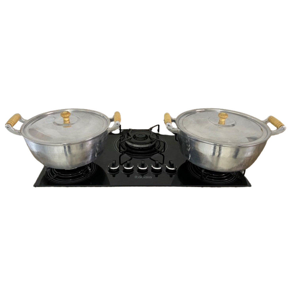 Está procurando por panelas bonitas e de qualidade que vão durar pra vida toda e que ainda possuem um ótimo preço? Este conjunto é ideal para você. Antes de finalizar a compra confira a descrição e as medidas das panelas abaixo. Itens Inclusos: 01 Panela Caçarola nº24 com tampa. 01 Panela Caçarola nº26 com tampa. Medidas: Panela Caçarola nº24: 24 cm de diâmetro da boca, 10,5 cm de altura e capacidade de 3,8 litros. Panela Caçarola nº26: 26 cm de diâmetro da boca, 11 cm de altura e capacidade de 4,5 litros. A espessura das paredes das panelas é de aproximadamente 5 a 6 milímetros. As bordas são ainda mais grossas, para impedir que haja trincas. Peso do conjunto de aproximadamente 2,4Kg. Esse conjunto de panelas têm certificação do INMETRO e são de alumínio fundido (batido) grosso, que apresenta alta durabilidade e praticidade. Elas ocupam pouco espaço para armazenamento, podendo ser encaixadas uma dentro da outra. A fabricação é com alumínio de excelente qualidade e elevado grau de pureza, o que impede a existência de trincas e fissuras. Temos o melhor acabamento do mercado, confira os detalhes nas fotos. As panelas são muito resistentes a qualquer tipo de amasso e outros danos. O material é reforçado e polido por dentro e por fora, podendo ser usado esponjas de aço sem danos as panelas. O alumínio não enferruja nem escurece com o tempo. Devido às propriedades do alumínio e à espessura alta das panelas, a comida permanece quente por muito mais tempo. Além disso, os alimentos podem ser preparados rapidamente, gerando economia de gás e também sem grudar nas panelas. As alças são inteiriças, fundidas juntamente com o restante da panela garantindo durabilidade estendida. O uso de madeira envernizada nas alças faz com que elas não esquentem muito durante o uso e tenham uma excelente durabilidade. As tampas são de alumínio repuxado, com bom encaixe e praticidade. Temos a opção com os puxadores (batoques) das tampas de madeira envernizada que não esquenta muito durante o uso no fogão, e também na opção com os puxadores das tampas (batoques) de baquelite, um material super resistente ao calor e isolante térmico, que não esquenta durante o uso. Ideal para fogão a gás, fogão a lenha, fogão industrial, cooktops a gás e elétricos, entre outros. Temos o produto em estoque e postamos tudo nos Correios logo após a compra. Os produtos enviados são exatamente os mesmos das fotos. Temos também panelas de vários outros tamanhos e modelos. Confira nossos produtos entrando na página da nossa loja. A venda faz parte da Garantia Shopee, portanto a sua compra é garantida sem risco de ter prejuízos. Acompanhamos todo o processo de envio, auxiliando até que o produto seja entregue. Restou alguma dúvida? Sinta-se à vontade para nos deixar uma mensagem no chat. Estamos sempre à disposição para tirar suas dúvidas.