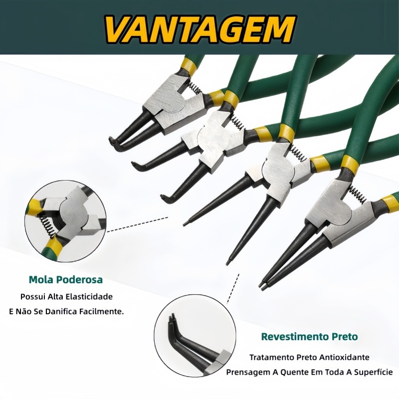 Bem vindo às melhores coisas Uma loja perto de São Paulo, ambiente 24 horas e pré-visualização de produtos de 3 a 4 dias. 📢🔥🔥Sobre o escopo da garantia anual: ❤Problemas de produto, antipatia pelas encomendas recebidas, peças fora de estoque, aparência do produto original 📢🔥🔥 Em relação a problemas no recebimento da mercadoria: 🚚(Após receber o produto, verifique se há algum vazamento ou dano ao produto) 👉Se o produto recebido estiver rachado ou danificado 👉Se faltar alguma peça no produto recebido. Por favor, rejuvenesça todos os itens que você recebeu, tire fotos e envie-os para atendente, explique quais peças estão faltando e reenvie as peças para você. 👉As senhoras do atendimento ao cliente estão online 24 horas por dia para responder suas perguntas em tempo hábil ESCOLHA O MODELO DESEJADO NA HORA DA COMPRA O PREÇO SE REFERE A UMA UNIDADE · Indicado para anéis de 19 a 60 mm · Pontas de 2 mm para encaixe preciso · Aço de alta qualidade com cabos antiderrapantes · Aplicação interna e externa, reta e curva · Ferramentas profissionais com ótimo custo-benefício Especificações Técnicas Tamanho: 7 polegadas (aprox. 18 cm) Tipos inclusos: • Interno reto • Interno curvo • Externo reto • Externo curvo